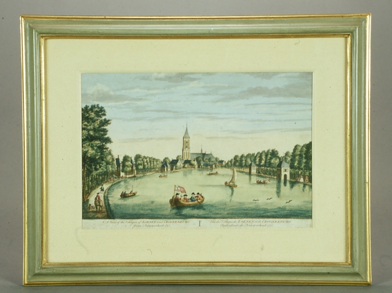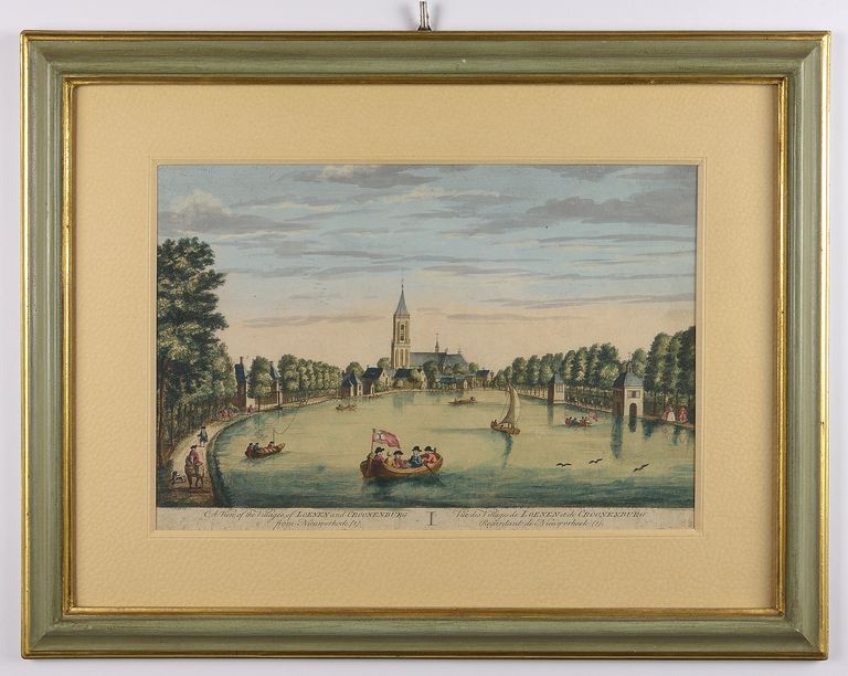 Paesaggio lacustre con in primo piano piccole imbarcazioni. La barca in primo piano ha quattro uomini e una donna a bordo, mentre alle spalle una imbarcazione ha la vela spiegata. Sullo sfondo, villaggio con chiesa. Il lago è circondato da numerosi alberi.