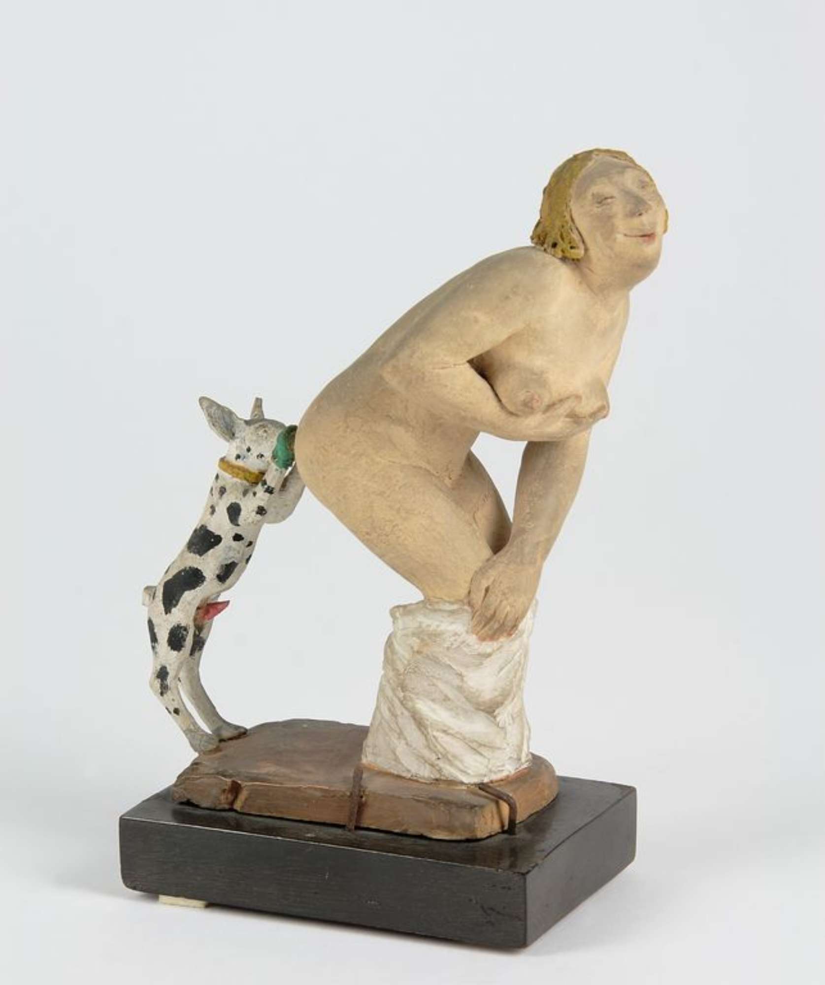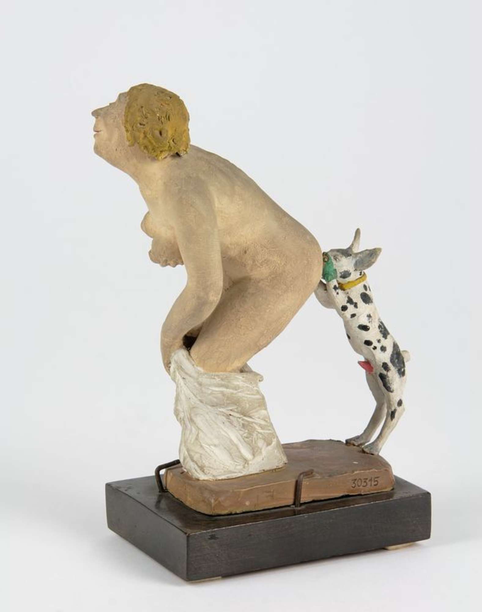 La scultura presenta una donna nuda ritratta stante nell'atto di sporgersi in avanti. Con la mano destra stringe a se i seni mentre con quella sinistra cerca di trattenere una veste raccolta all'altezza delle caviglie. Dietro alla figura umana è posizionato un cane maculato ritto sulle gambe posteriori e con quelle anteriori appoggiate sui glutei della donna.