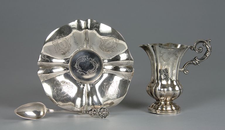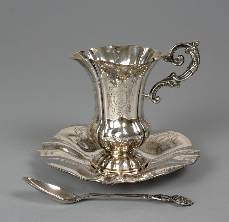 Argento inciso, sbalzato, cesellato. La tazza presenta una struttura elegante con ansa composta da volute, orlo estroflesso e maggiormente aggettante nella parte frontale. Il corpo rastremato presenta un basso ventre con costolonature e poggia su di un piede strozzato. Le pareti del corpo sono decorate da medaglioni incisi. Il piattino presenta un orlo polilobato e la parete quadripartita da doppie costolonature. In ogni singola porzione di parete leggermente umbonata è presente la stessa decorazione incisa che si ritrova sulla tazza. Il cucchiaino ha una struttura lineare e una terminazione decorata a rilievo. All'interno di volute è rappresentata una semplificazione di una favola di Esopo. Si vede una volpe intenta a cercare di mangiare del cibo all'interno di un vaso dallo stretto collo mentre sulla destra della scena si trova una cicogna.