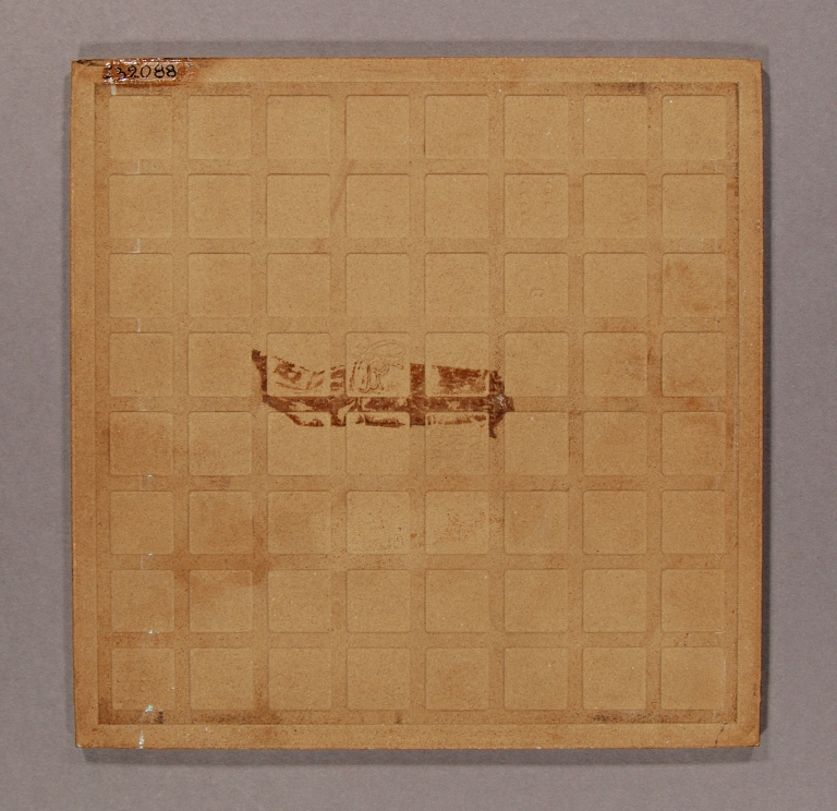 Piastrella decorata con 3 serigrafie di colore giallo, blu e bianco su smalto di colore verde a creare una composizione con linee parallele formate da piccoli punti; alcune di queste linee sono intercalate da 5 piccoli decori in blu e giallo. Su un lato della piastrella una fascia di colore bianco dal profilo irregolare e parzialmente bordato di blu.