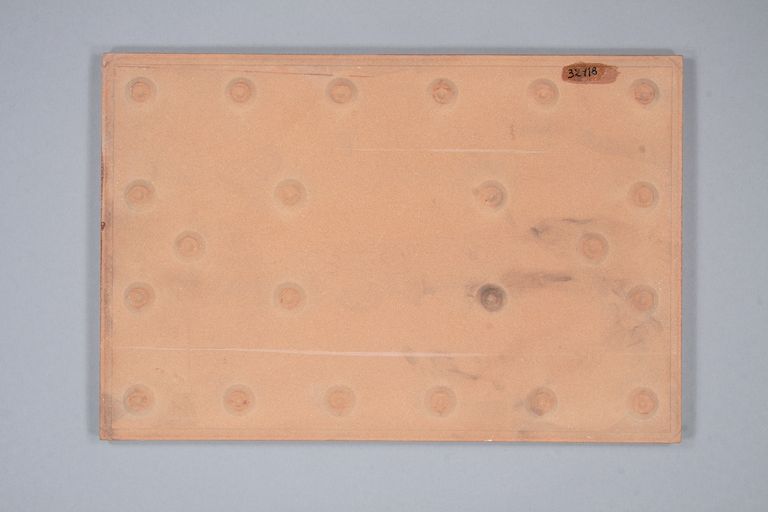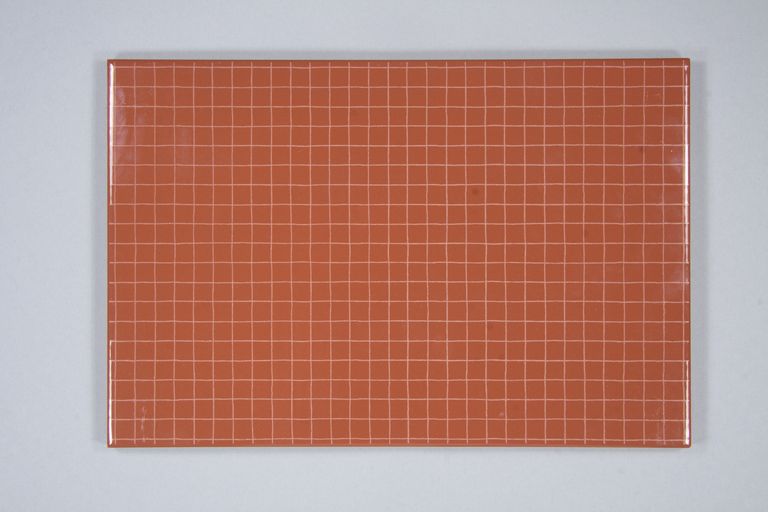 Piastrella decorata con una serigrafia di colore beige sopra smalto di colore marrone-rosso. La decorazione si compone di un reticolo di quadrati.