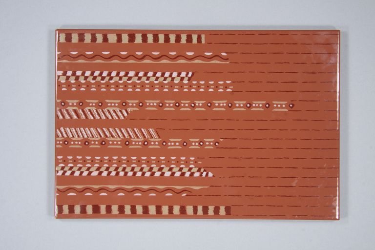 b: piastrella decorata con tre serigrafie di colore rosso, beige e bianco sopra smalto di colore marrone. La decorazione si compone di 20 righe discontinue, alcune coppie di righe terminano in fasce con vari elementi geometrici (linee oblique, linee ondulate, puntini, cerchi, mezzi cerchi), alcune fasce sono campite in due colori alternati.