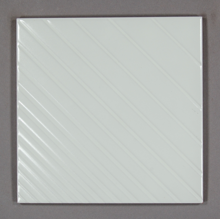 Serie "Traccia", piastrella smaltata in bianco madreperlaceo e decorata a rilievo con fasce oblique che si restringono passando da un angolo a quello opposto.