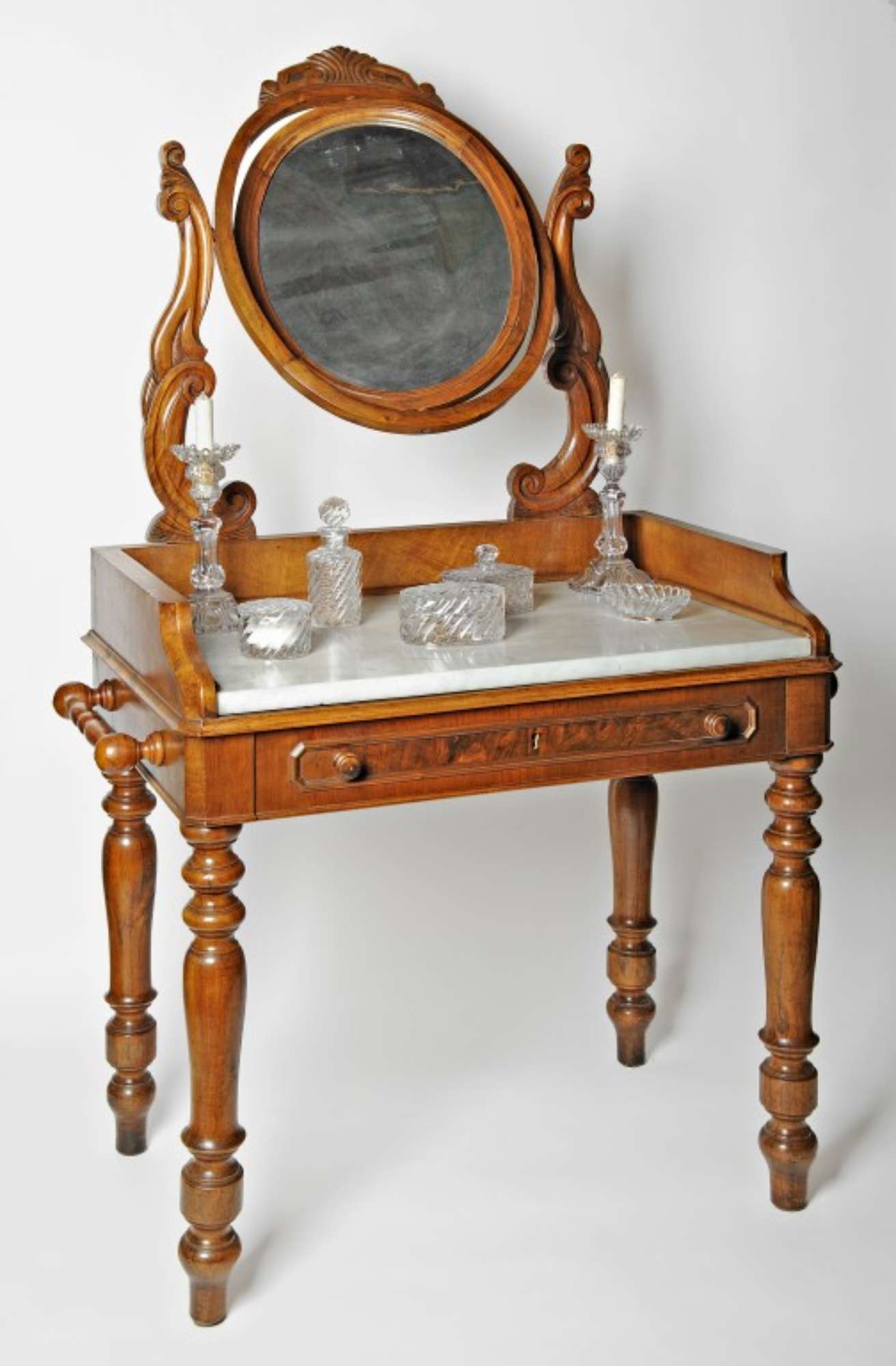 tavolino con lunghe gambe tornite a birillo e piedini a trottola allungata; cassettino anteriore impiallacciato in radica. Montanti laterali modanati e piano in marmo bianco. La specchiera a bilico è incernierata su due montanti a volute vegetali e coronata da una piccola cimasa con palmetta.