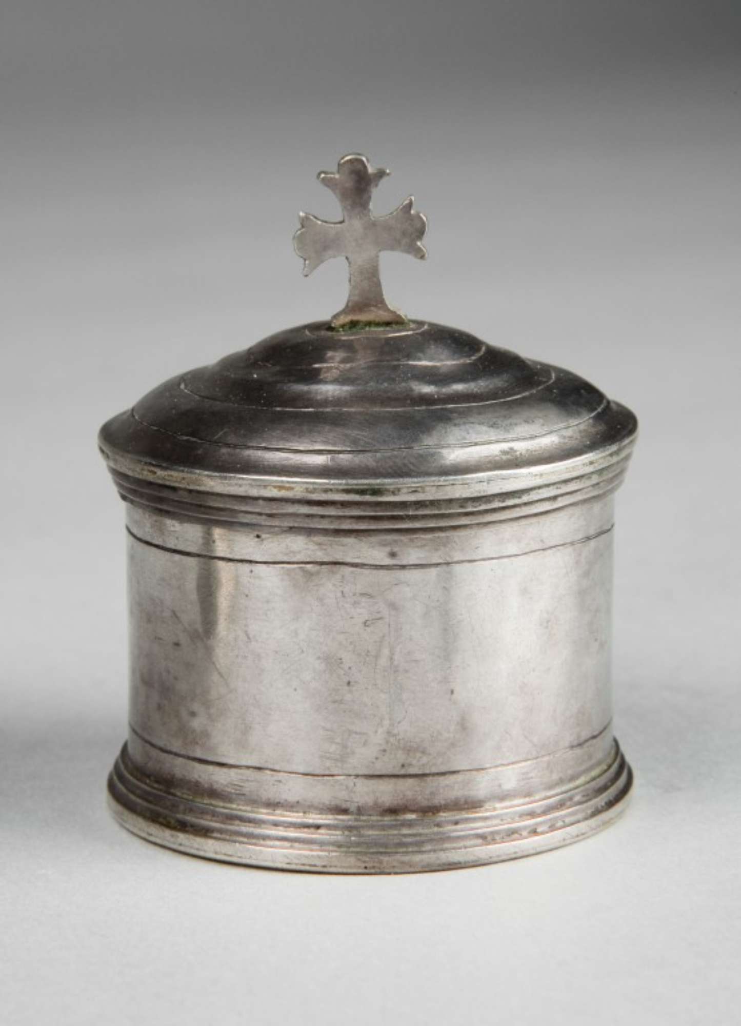 Il vasetto per l'olio degli infermi è realizzato in argento inciso
