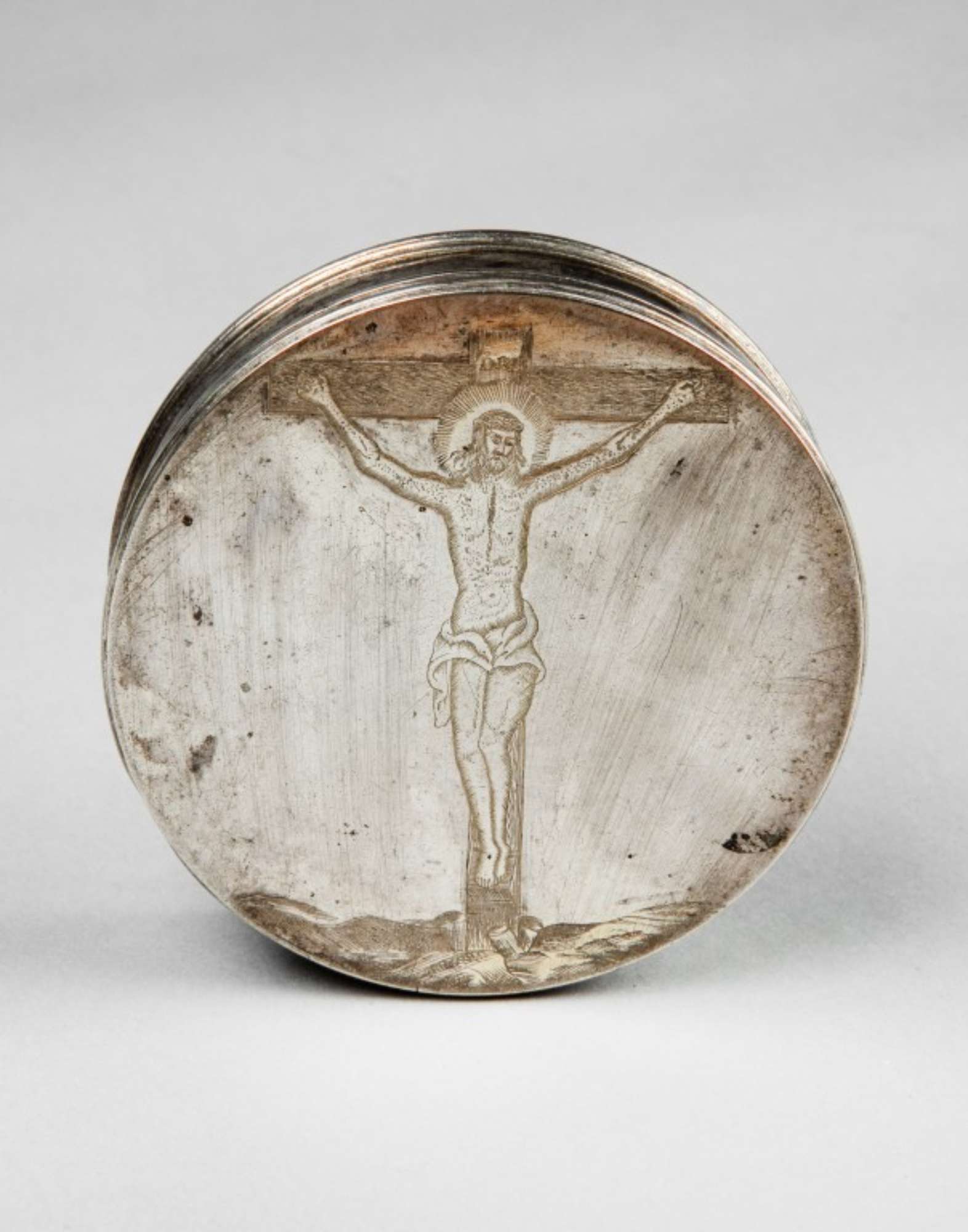 Il porta ostie è d'argento stampato e inciso; su un lato raffigura la 'Crocifissione'.