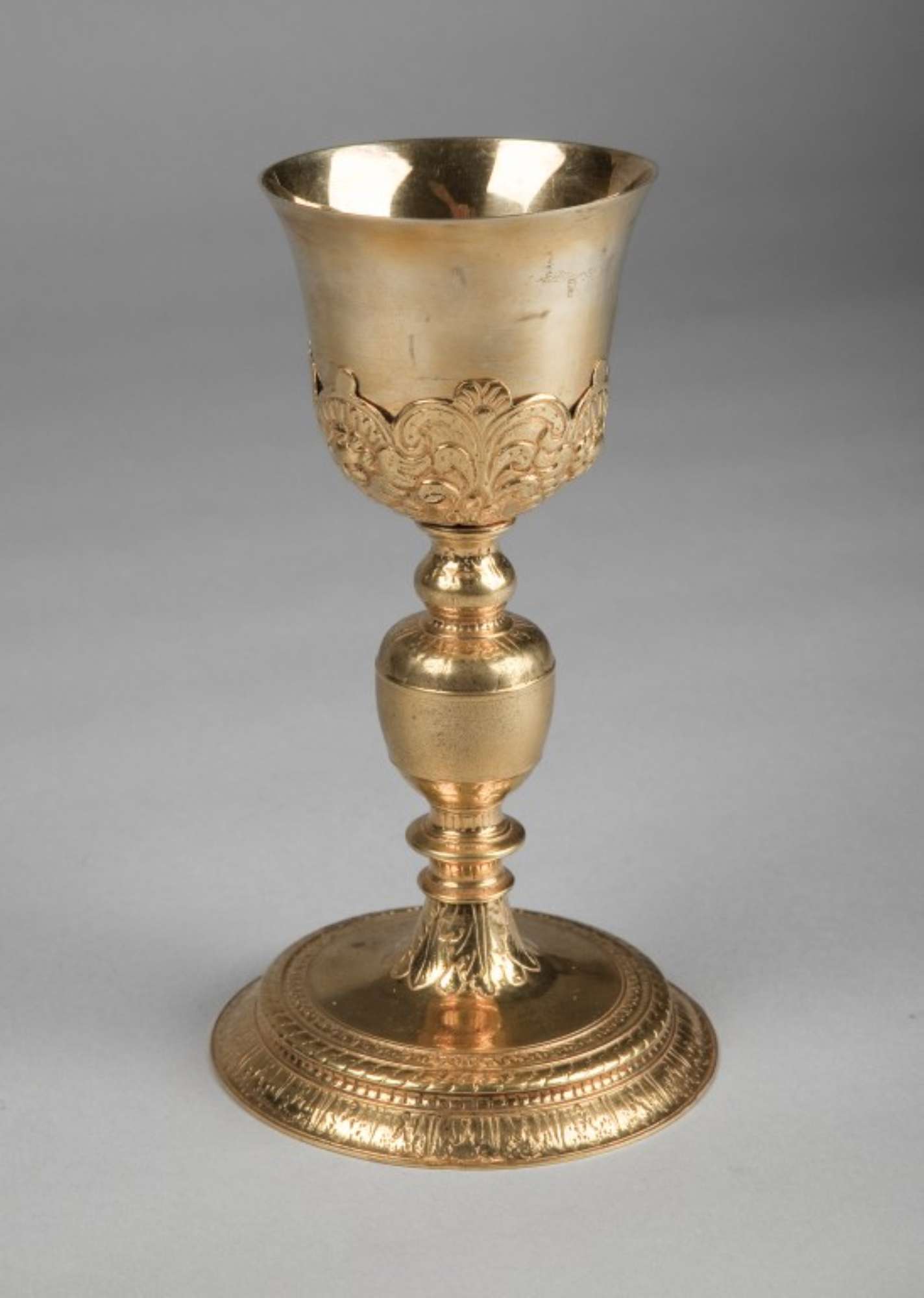 Il calice, dalle finiture grossolane, è di produzione seriale e ripropone ecletticamente repertori e forme rinascimentali.