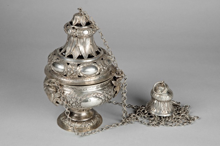 Il turibolo, di pregevole fattura, è databile alla fine del Settecento ed è ornato con motivi neoclassici e tardo-rococò. E' associato alla navicella inv. IJ45b, che presenta gli stessi stilemi e motivi decorativi.