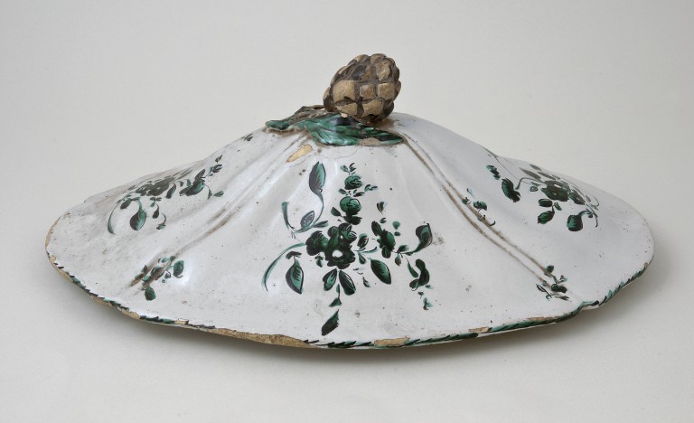 Il coperchio per zuppiera è databile al Settecento ed è riconducibile alla manifattura Ferniani.