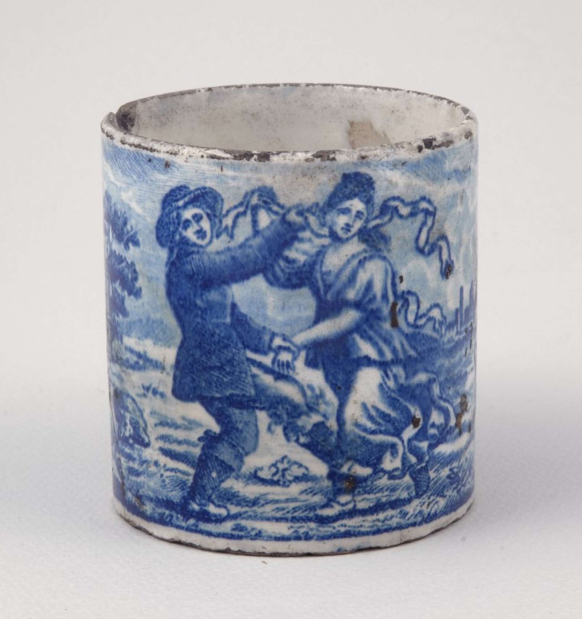 La tazzina, di maiolica dipinta, è del tipo 'a parete cilindrica', su base piatta e provvista di manico 'a profilo squadrato'; sulla perete esterna, in monocromia blu, è raffigurata una scena di ballo campestre.