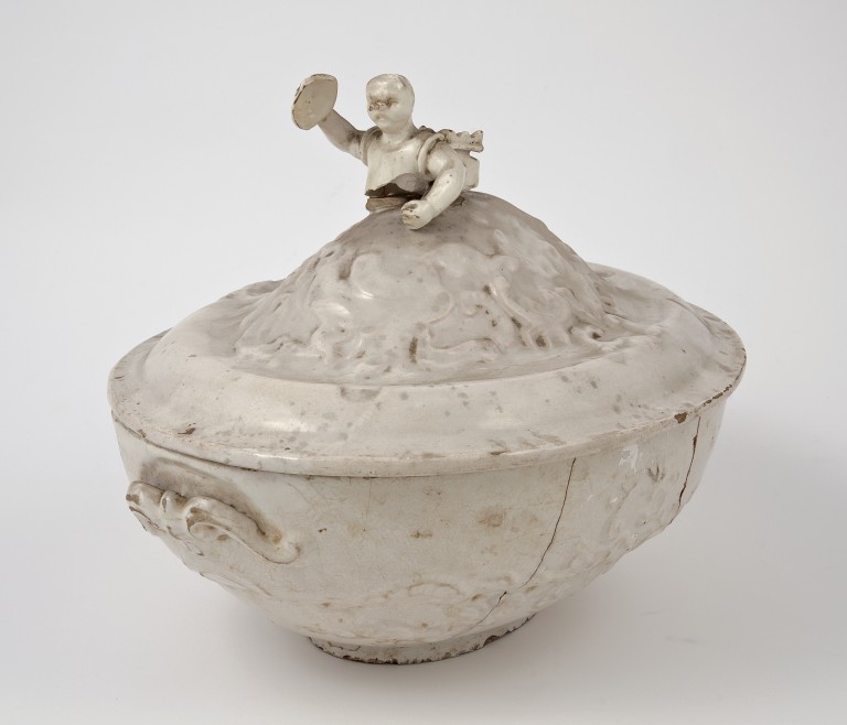 La zuppiera è un manufatto di pregio in maiolica bianca faentina. In virtù della tipologia e degli ornamenti barocchi è probabilmente databile alla seconda metà del Seicento. La statuetta di terraglia sul coperchio è stata applicata al posto della perduta presa originaria.