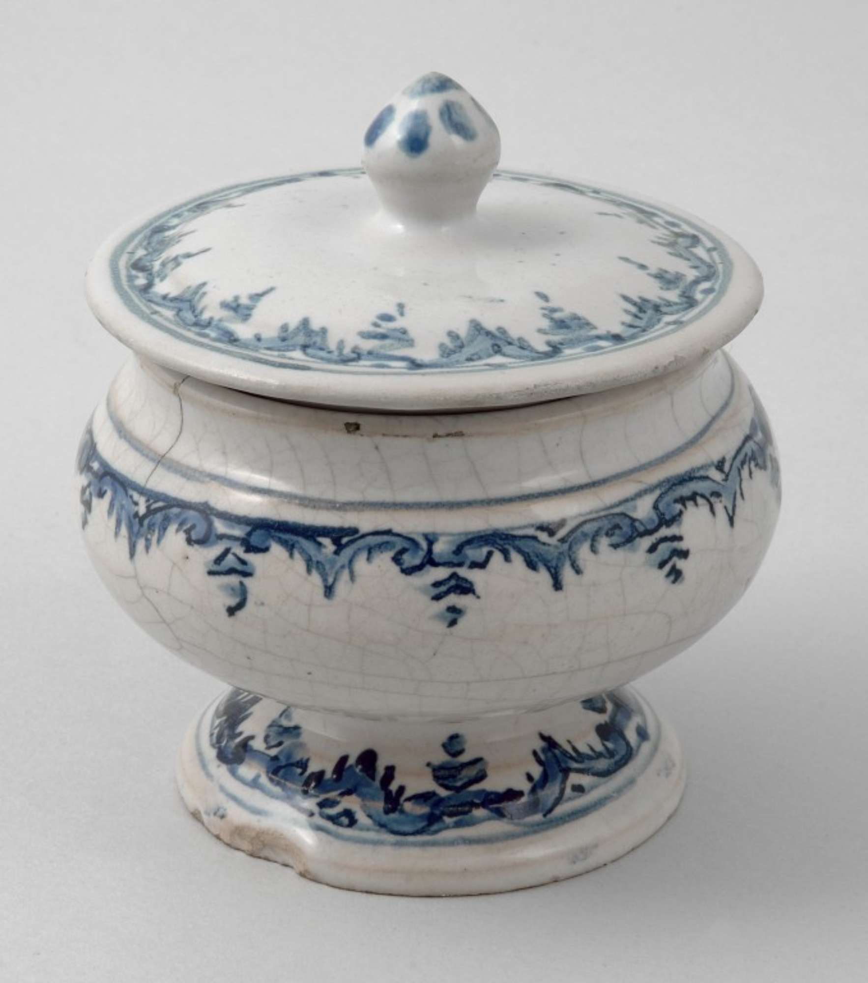 Il porta spezie di maiolica decorata è provvisto di coperchio ed è impostato su un alto piede.