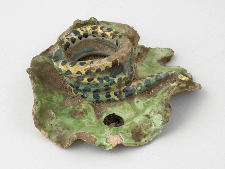 La bugia, di maiolica dipinta, è a forma di serpente.