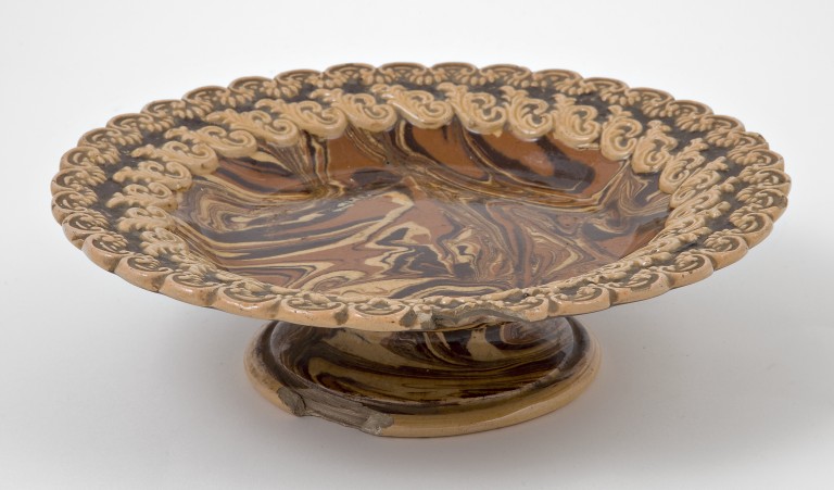 L'alzata presenta tutti i caratteri dei manufatti della Fabbrica Francesco Perotti di Mondovì, attiva solo per pochi anni (1805-1810). Gli oggetti marmorizzati erano alla base della produzione Perotti, ed erano ottenuti impastando con grande abilità terre di diverso colore.