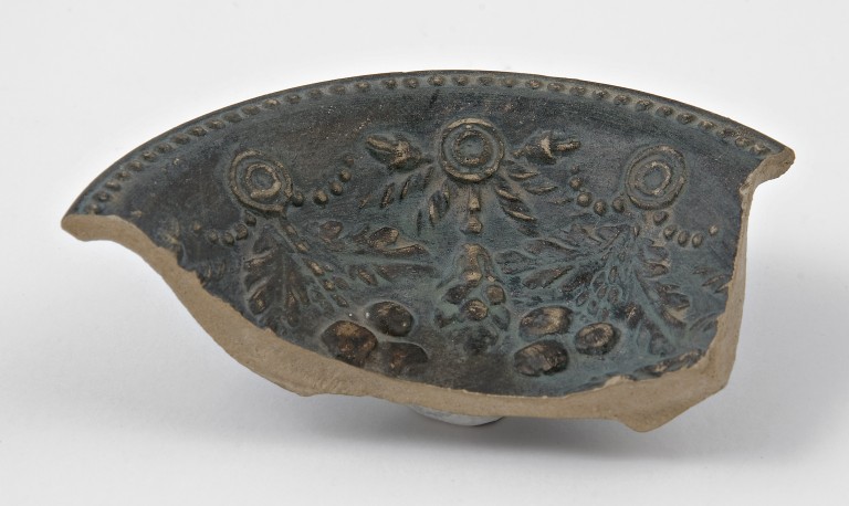 La scodella è decorata a rilievo con festoni all'antica; la superficie è brunita.