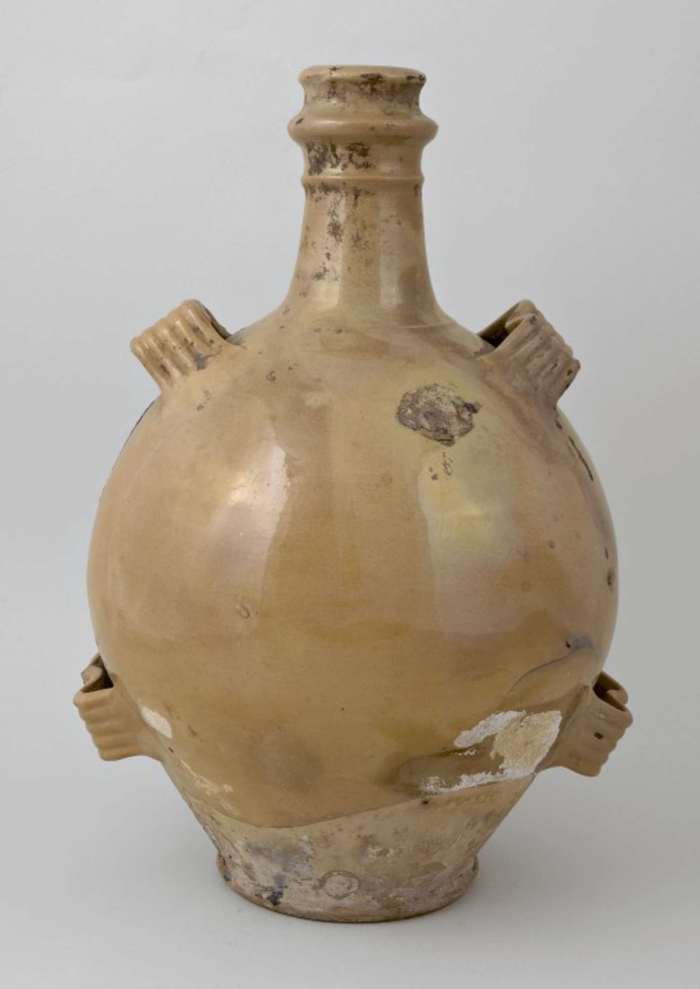 La fiasca, ingobbiata e invetriata, è di forma globulare, con alto collo e bocca sporgente. Sulle spalle e sui fianchi sono applicati quattro manici contrapposti del tipo 'a nastro'. E' verniciata di giallo.