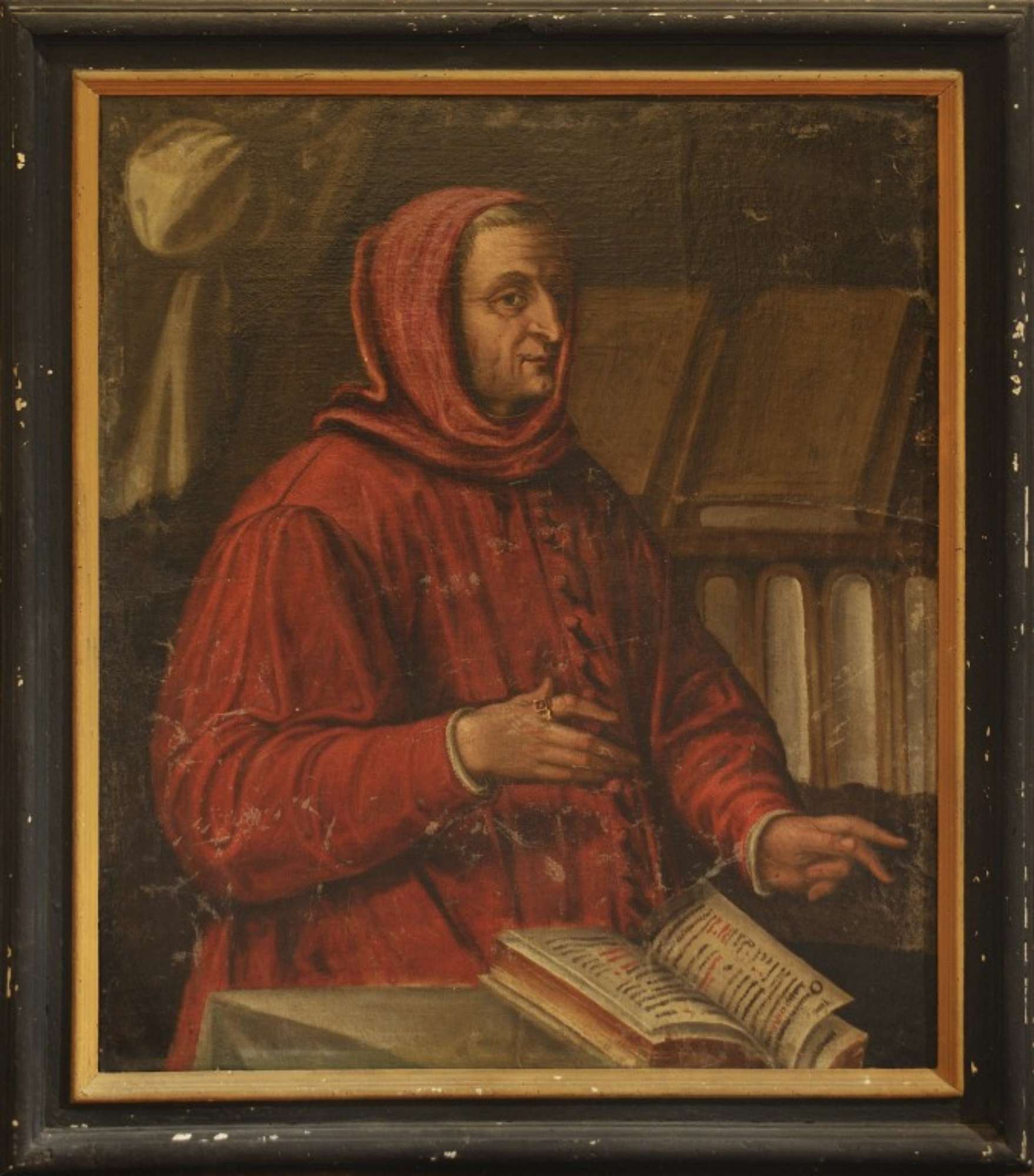 Il dipinto a olio su tela raffigura Giovanni Campeggi in abito da giurista, in piedi di fronte a una libreria mentre consulta un libro.