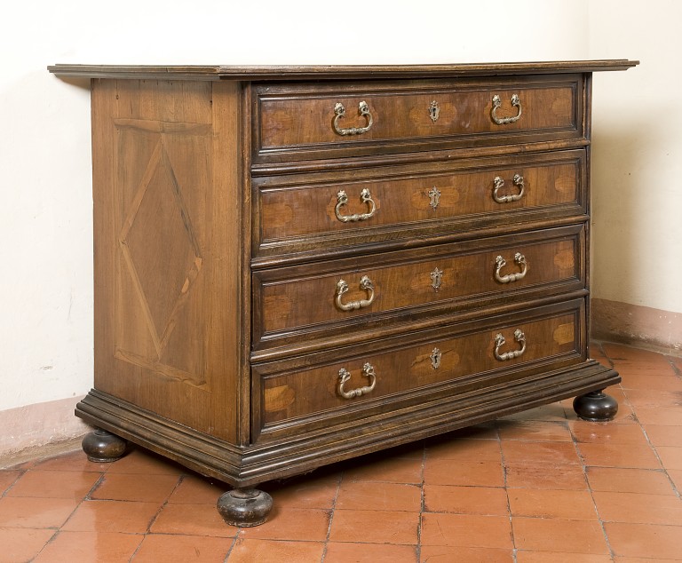 Il cassettone di legno di noce modanato, tornito e verniciato è a quattro cassetti a doppia maniglia di metallo ed è sostenuto da quattro piedi torniti.