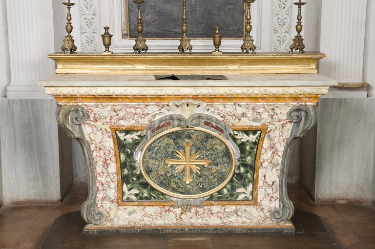 L'altare di stile barocco è di legno scolpito e dipinto 'a finto marmo'; al centro, all'interno una cornice a linee convesse, è posto un ovato contenente una croce dorata.