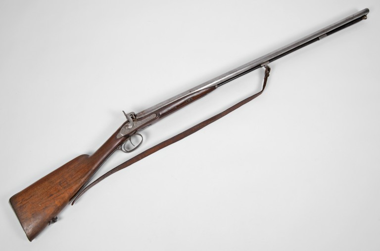 Doppietta da caccia a luminello, epoca 1850 ca. Completa di bacchetta con cavastracci e di bretelle di cuoio. Calibro 16.5. Il rifacimento della calciatura in legno di noce, forse si deve ad un modesto artigiano che lo eseguì in epoca successiva. (Gianpaolo Reggiani)