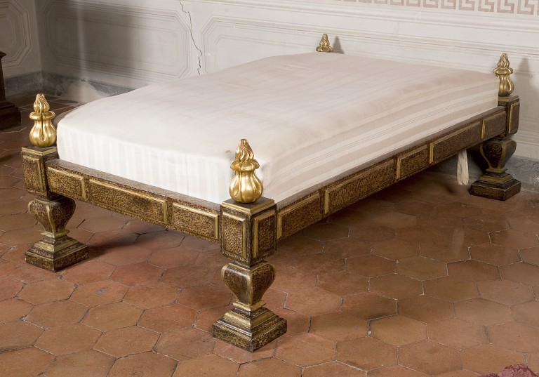 Il letto di legno modanato, intagliato e verniciato, è sostenuto da quattro piedi di stile barocco, sormontati da quattro fiammelle di legno intagliato.