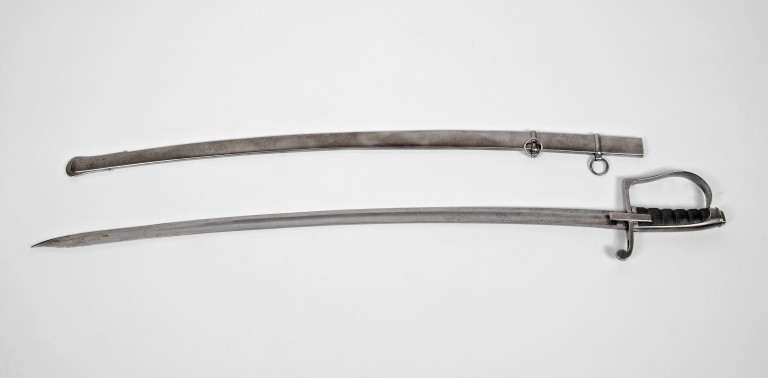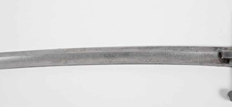 Lama in acciaio, elsa ad un solo ramo di guardia, elso posteriore a riccio con spacco per la dragona, alette fermafodero rettangolari, cappetta lunga con dorso sfacettato, dado ottagonale avvitato sul codolo. Impugnatura in ebano a settori zigrinati, lama cesellata con cresta centrale sgusciata. Fodero a due campanelle con bocchetta a due intagli per il passaggio delle alette.