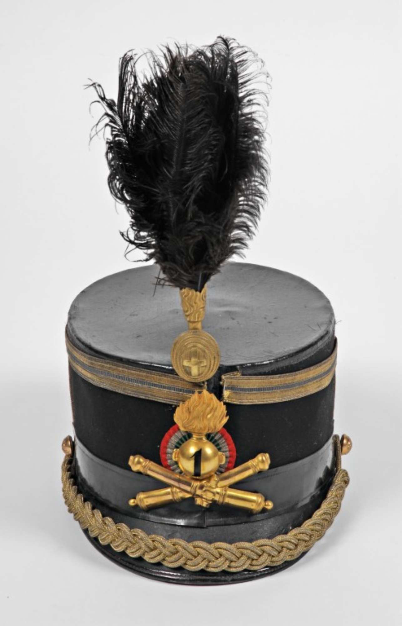 Fusto cilindrico ricoperto di panno nero; piccola visiera in cuoio nero, gradi di tenente in gallone dorato, fascia in pelle nera lucida, fregio del 1° Reggimento artiglieria su coccarda bianco rosso verde, sormontato da nappina metallica con croce sabauda, portante un pennacchietto in piume di penne. Imperiale in pelle nera, sottogola a cordone in treccia dorata fermato da bottoncini con fregio d'artiglieria ed agganciato sul retro all'imperiale. Profilature verticali laterali e posteriori in cordoncino dorato.(Giordano Cola; Elsa Silvestri)