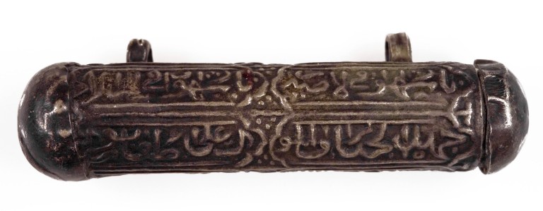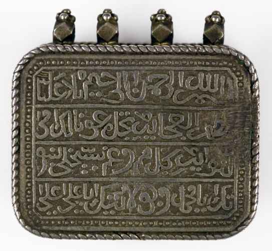 Nell'India occidentale, è radicato l'utilizzo di piccoli monili, come il presente Porta-Corano, nel quale sono inseriti piccoli pezzi di carta, che riportano i versetti di alcune sure. Nella tradizione islamica, infatti, l'autore del testo sacro, è Allah: al Corano, che viene trasmesso in forma scritta e rigorosamente in lingua araba, corrisponde un modello perfetto nei cieli, una copia sempre aperta davanti al trono di Dio. Da questo modo particolare di intendere la rivelazione divina, deriva la convinzione che anche il solo contatto con le parole di Dio abbia una duplice funzione apotropaica e taumaturgica.