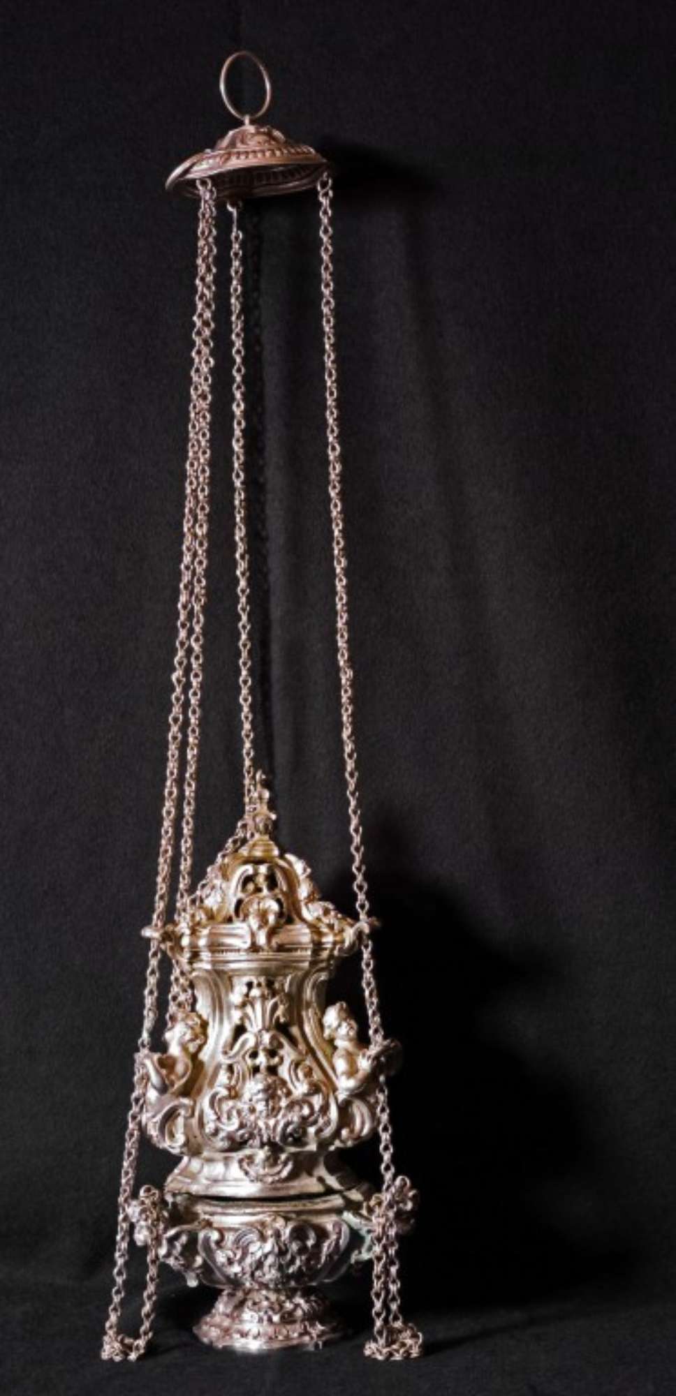 Più elegante, diventa la forma del turibolo durante la Controriforma: come nel presente oggetto, commissionato da mons. Colombani, il coperchio del turibolo si arricchisce di decorazioni floreali di delicati cherubini, che regone le catene a cui il coperchio è agganciato.