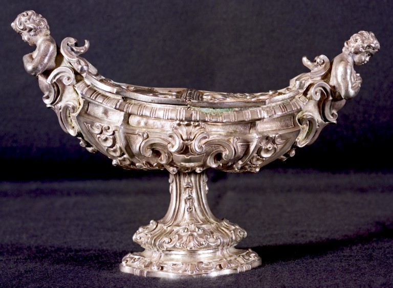 Navicella portaincenso in argento fuso, sbalzato, cesellato e bulinato.
