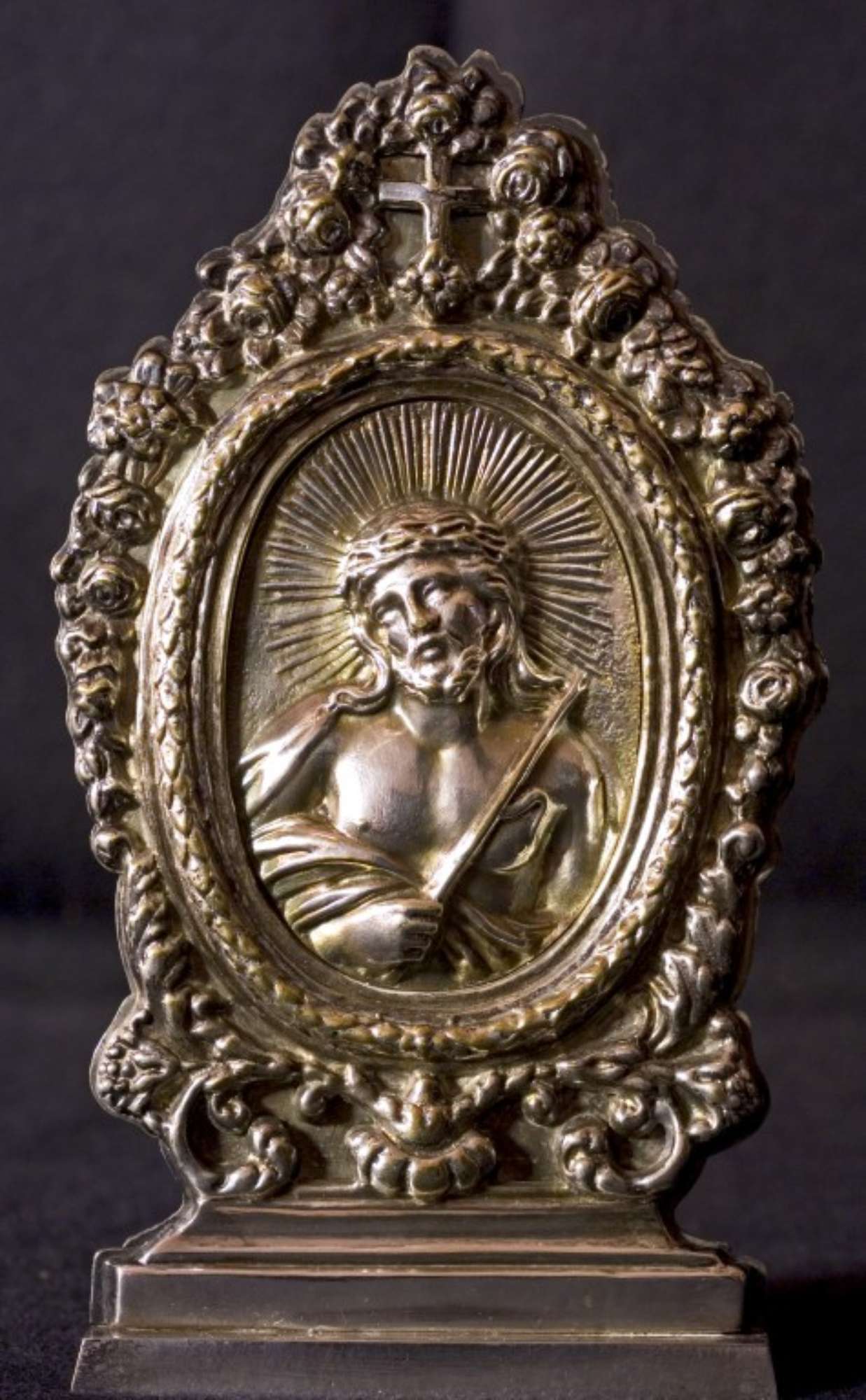 L'elegante pace, qui raffigurata, ha forma ovale, differendo sostanzialmente dalla tradizionale forma rettangolare: l'ovale presenta una decorazione floreale che culmina con l'immagine della croce, mentre al centro è rappresentato l'Hecce homo. L'uso della pace non è mai stato precettivo e la sua origine è piuttosto recente, in quanto risale al secolo XIII, quando venne introdotta nella Chiesa inglese a sostituire il bacio della paténa e del messale come gesto simbolico di pace. Una prima rapida diffusione di questo arredo la si ebbe ad opera dei grandi ordini monastici (presso i quali l'uso perdura ancora oggi), e il massimo della sua fortuna venne raggiunto durante il Rinascimento.