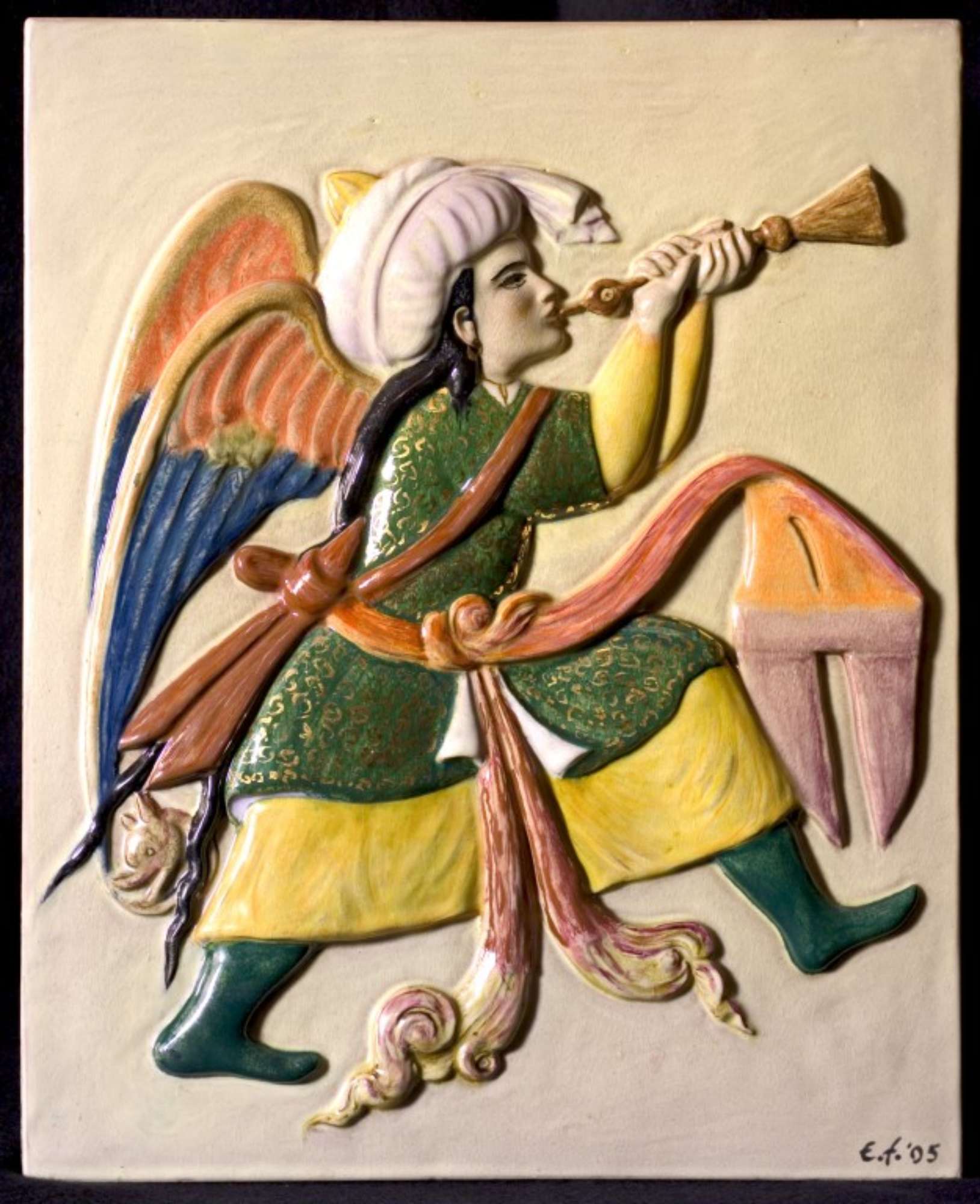 Rilievo in maiolica policroma con interventi a terzo fuoco in oro zecchino e lustri iridescenti.