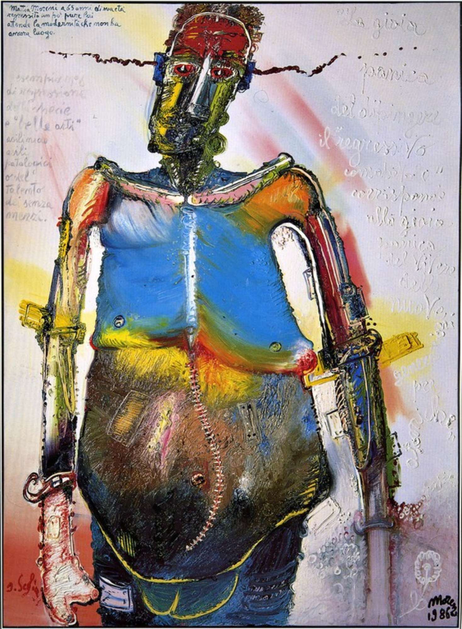 Figura umano-robotica che identifica l'artista avventore della modernità. L'uomo contemporaneo è minato nei suoi cromosomi da un'inarrestabile mutazione genetica che decreterà la fine della vecchia umanità. Accanto alla formulazione di una teoria della "regressione della specie", a partire dal 1983 Moreni si immerge nel panorama regressivo delle Belle Arti, indagando le declinazioni delle avanguardie al primitivo e all'infantile. Nell'esecuzione maldestra di un artista che ha in sé i germi della regressione, egli dipinge ibridi di un codice naturale e artificiale, ribelli alla stessa volontà del creatore.