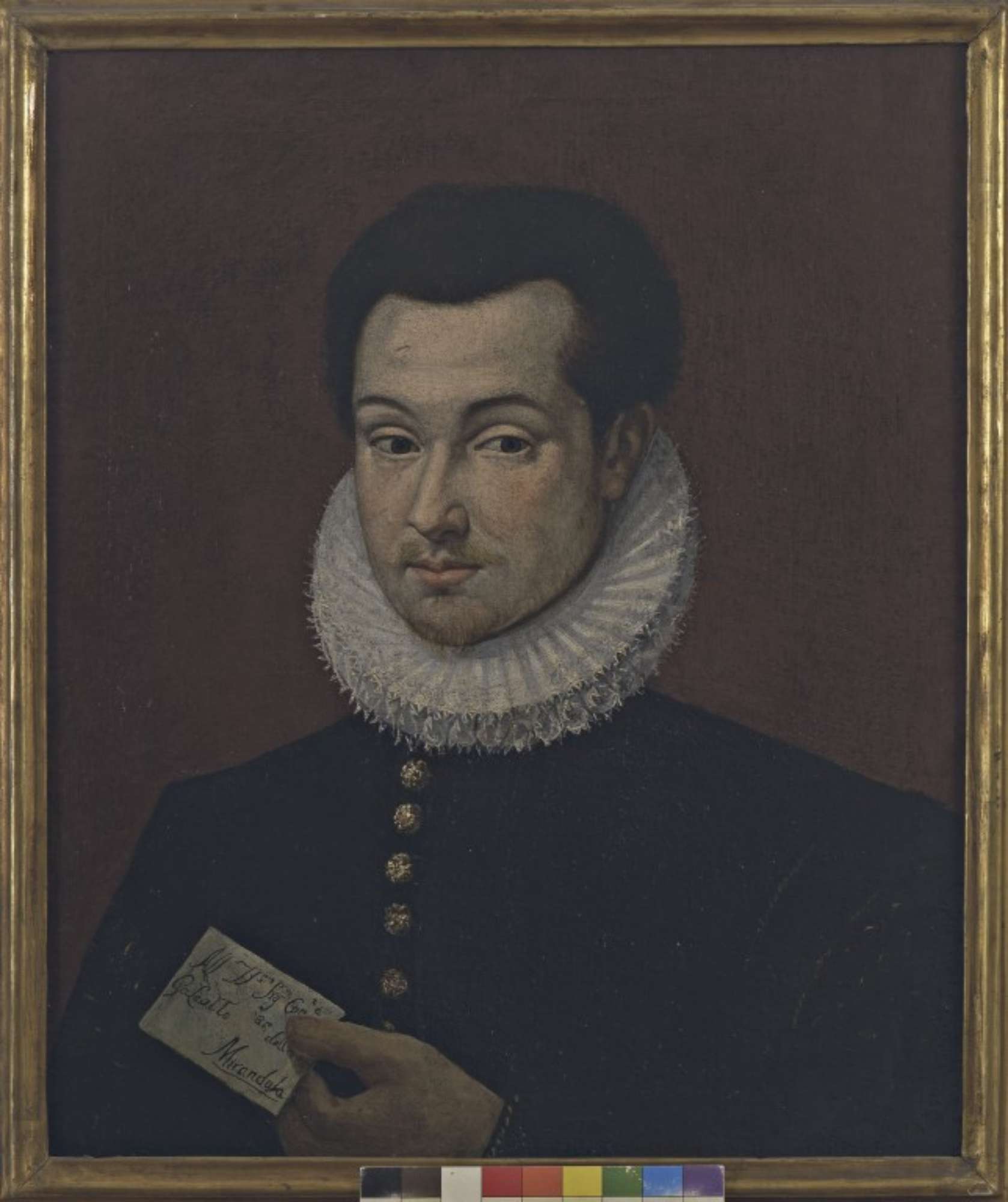 L'identificazone del personaggio spetta al Cappi e si avvale dell'iscrizione sul foglietto che il soggetto stringe nella mano sinistra. Ciò deve però essere considerato con cautela in quanto la mano pare di qualità inferiore rispetto al busto, quindi forse aggiunta a posteriori.