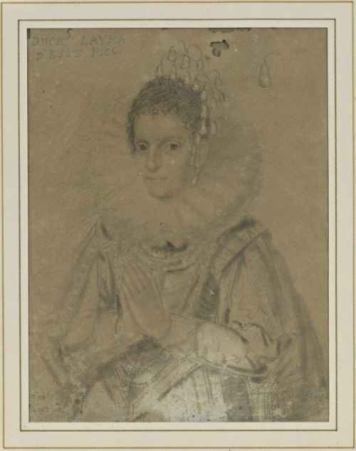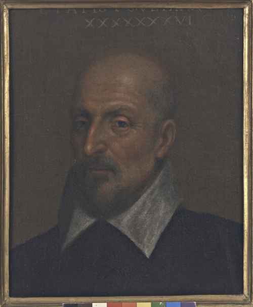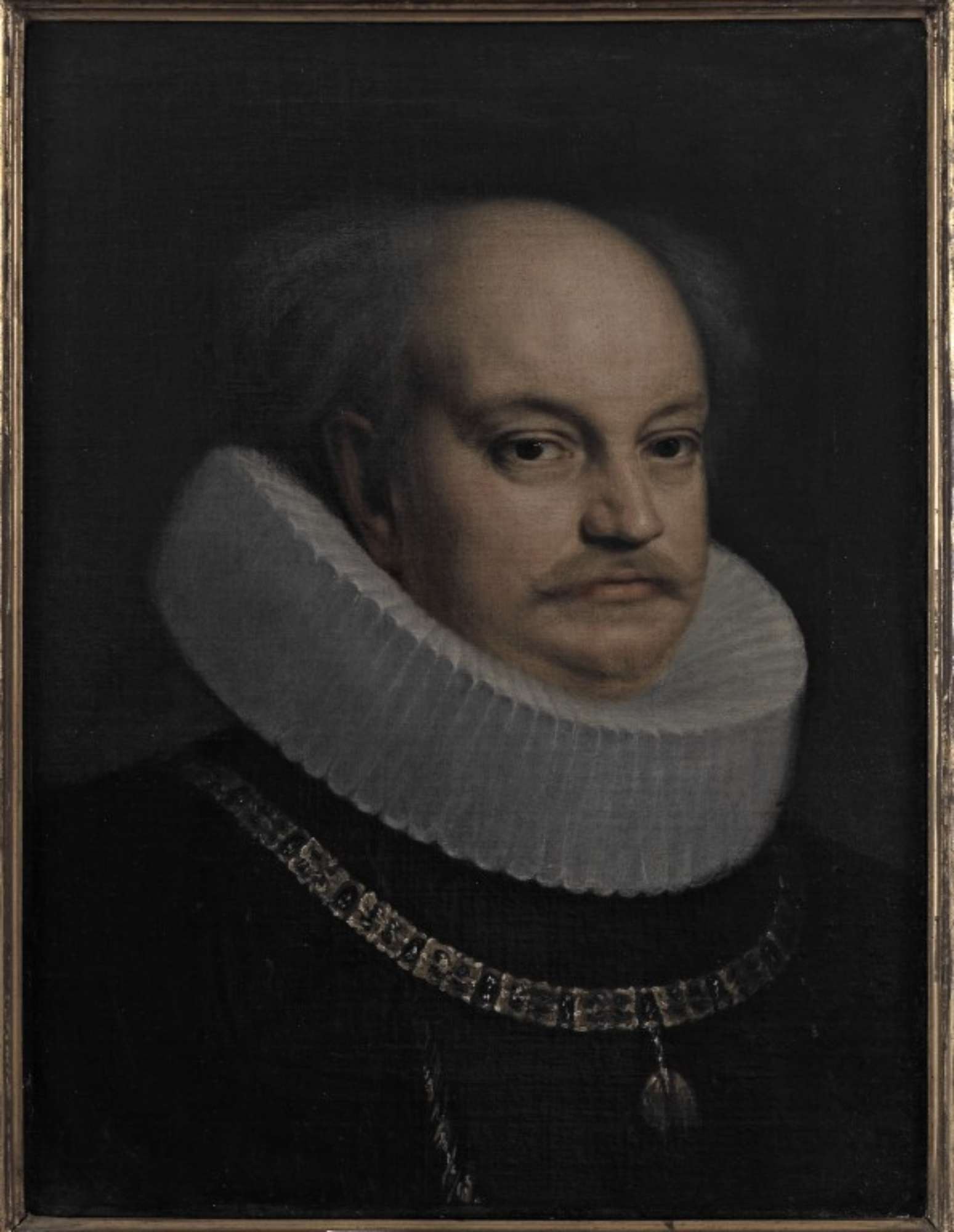 Abito nero, colletto imponente e pieghettato. Al collo la collana del Toson d'Oro. Capo scoperto. Sfondo scuro.