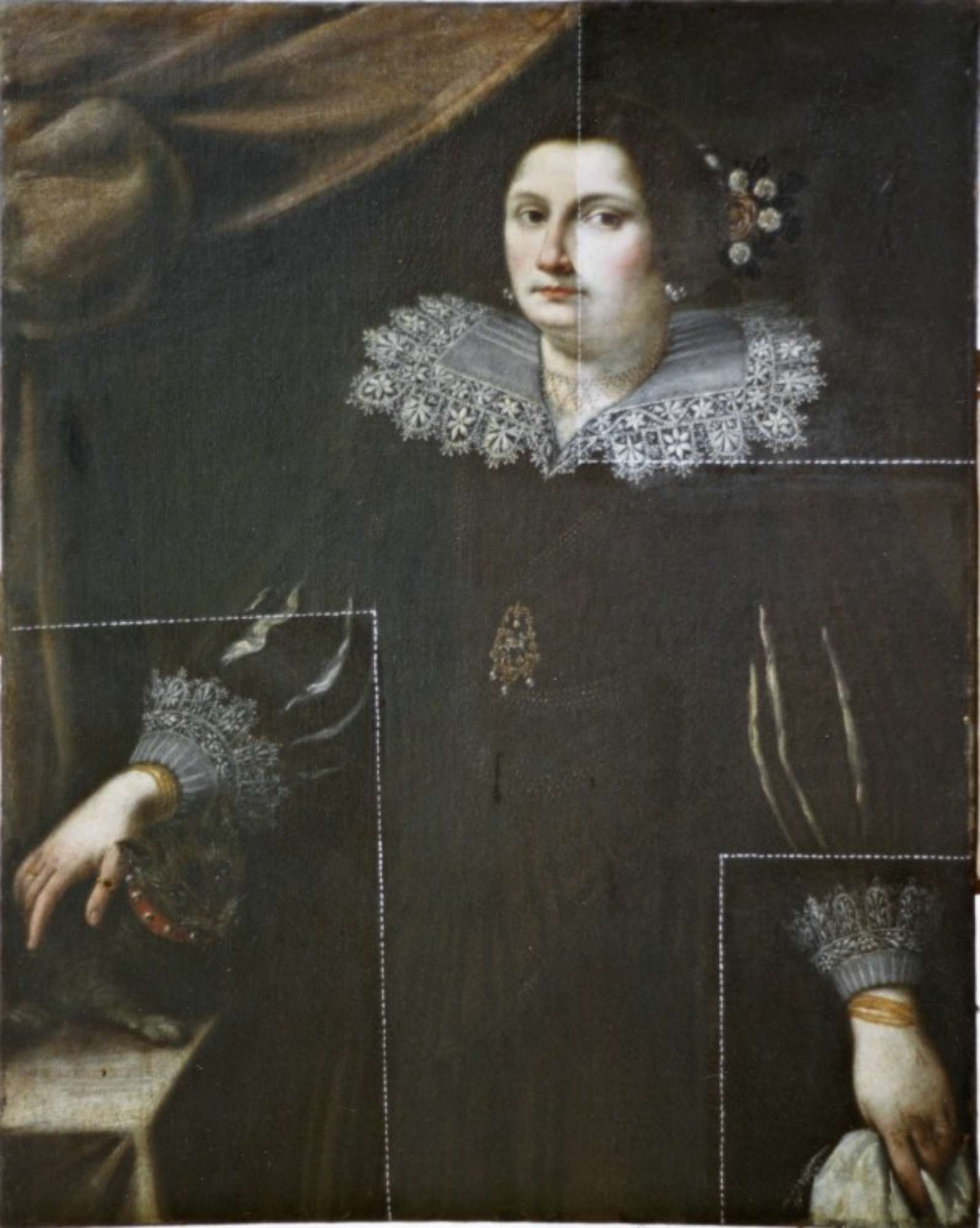 Ritratto a tre quarti di prospetto di Fulvia da Correggio. Veste nera finemente bordata con pizzo sui polsi e sul collo. Cappelli acconciati con fiori. Nella mano destra un fazzoletto, la sinistra accarezza un gatto nero. Sullo sfondo un tendaggio annodato.