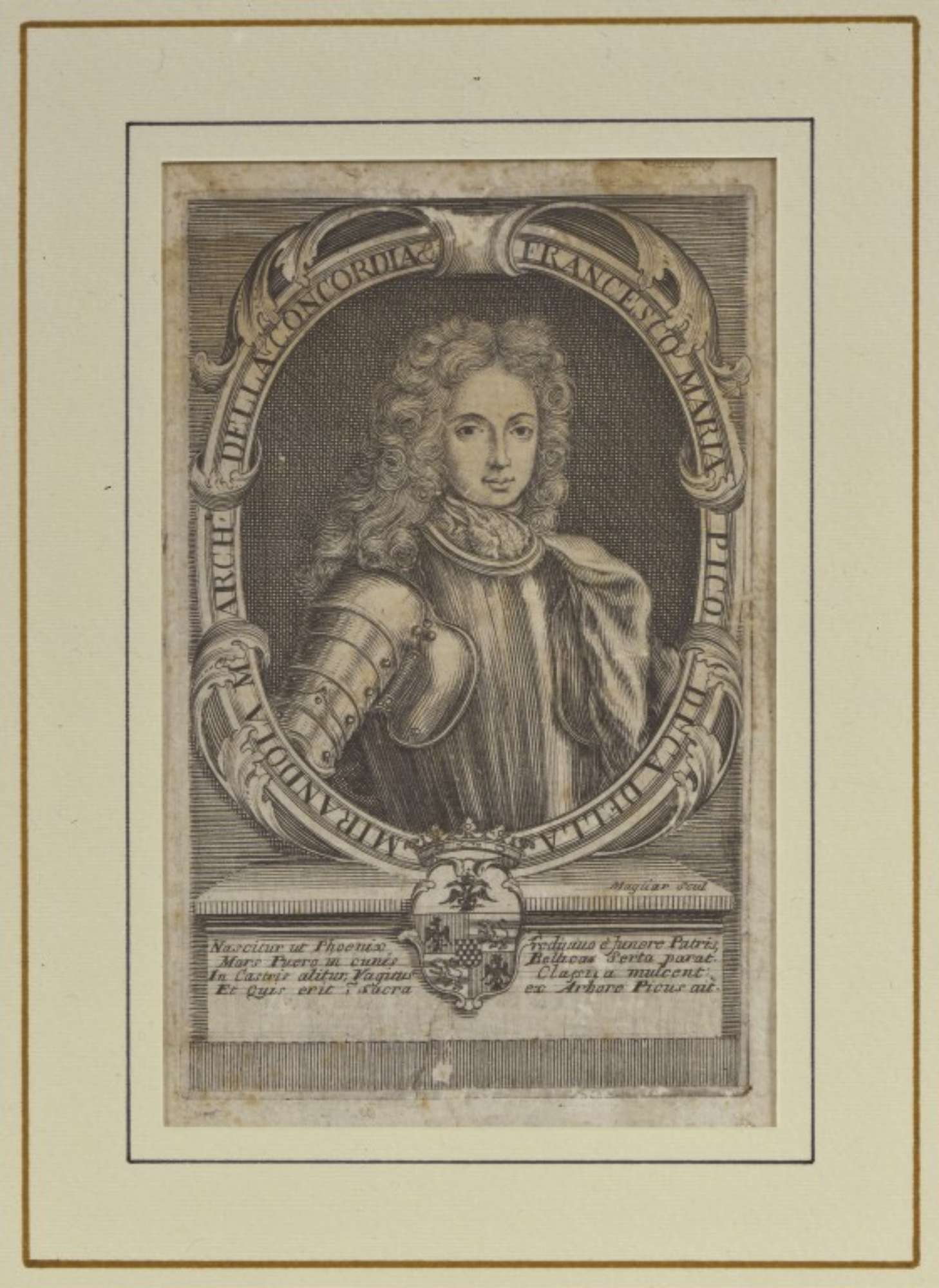 Incisione impressa su carta da lastra di rame a bulino. L'ovale che racchiude la figura contiene lo stemma di casa Pico.