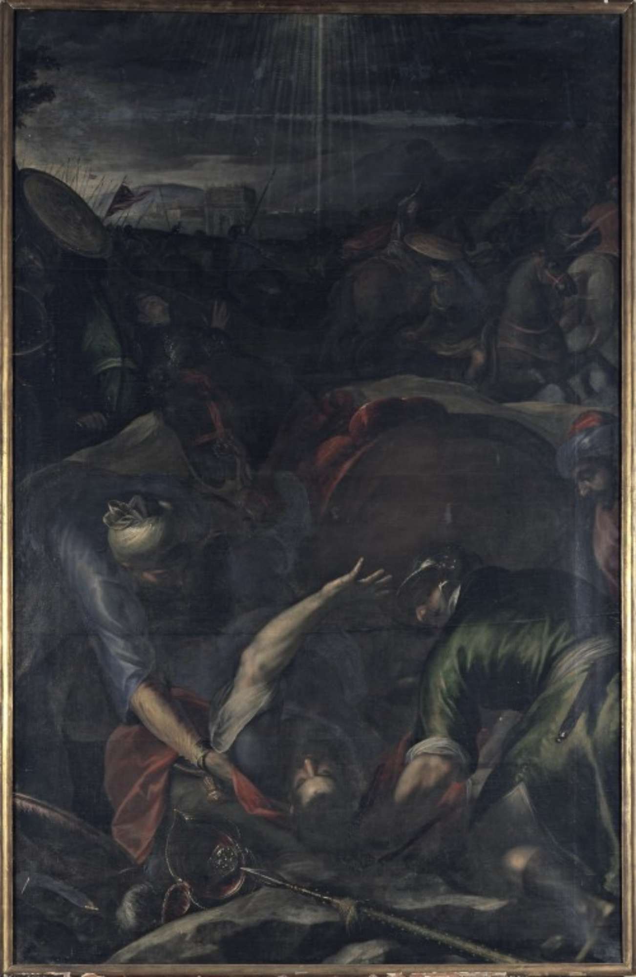 San Paolo è a terra, caduto a causa della luce celeste. Due compagni lo aiutano a rialzarsi, il cavallo alle sue spalle scalpita imbizzarrito. Sullo sfondo schiere di armate che si combattono e, in lontananza, le mura di Damasco. Colori fumosi e contrastanti.