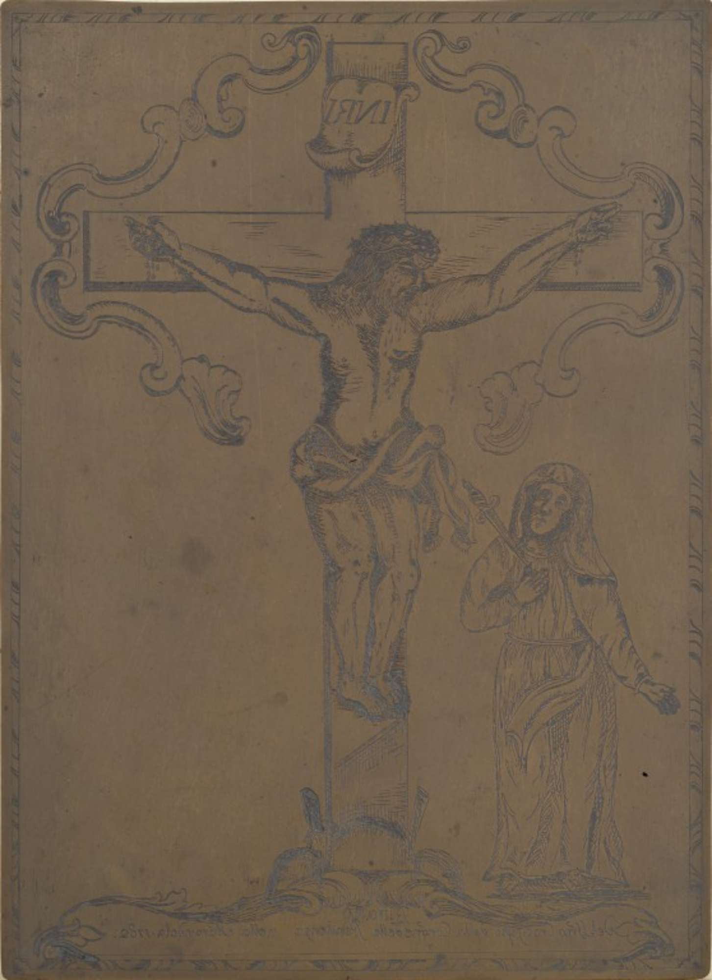 Lastra di rame incisa a bulino e acquaforte raffigurante il Crocifisso e la Madonna addolorata.