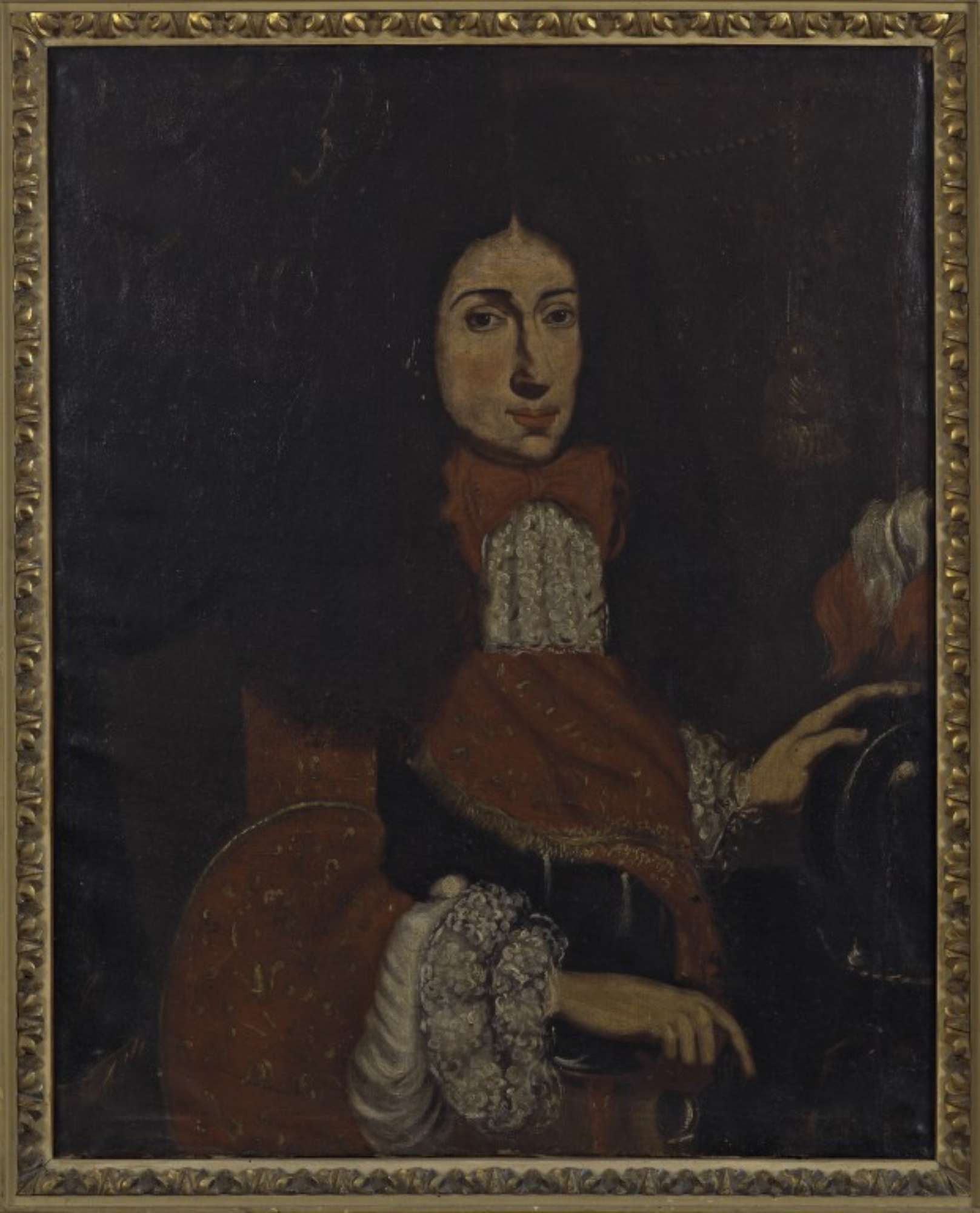 Ritratto a mezzo busto verso destra. Giovanni Pico indossa un abito di broccato rosso con ampi risvolti nelle maniche. Fascia a tracolla lungo la corazza. Cornice ottocentesca di legno dipinto.
