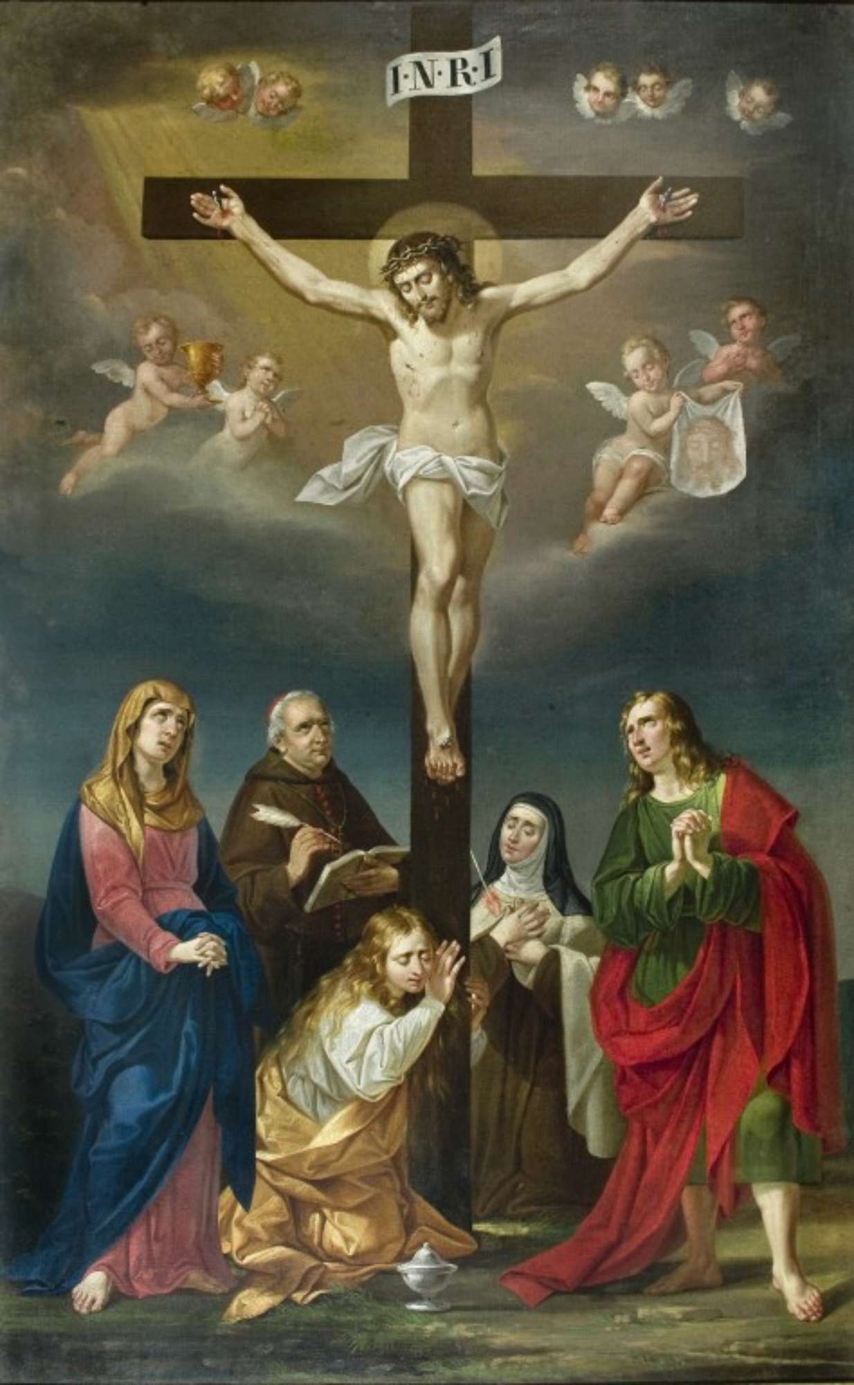 Il Crocifisso è circondato da angeli posti su nubi e recanti i simboli della passione. Ai piedi della croce la Maddalena, Santa Teresa, San Giovanni Evangelista, San Bonaventura e la Madonna addolorata.