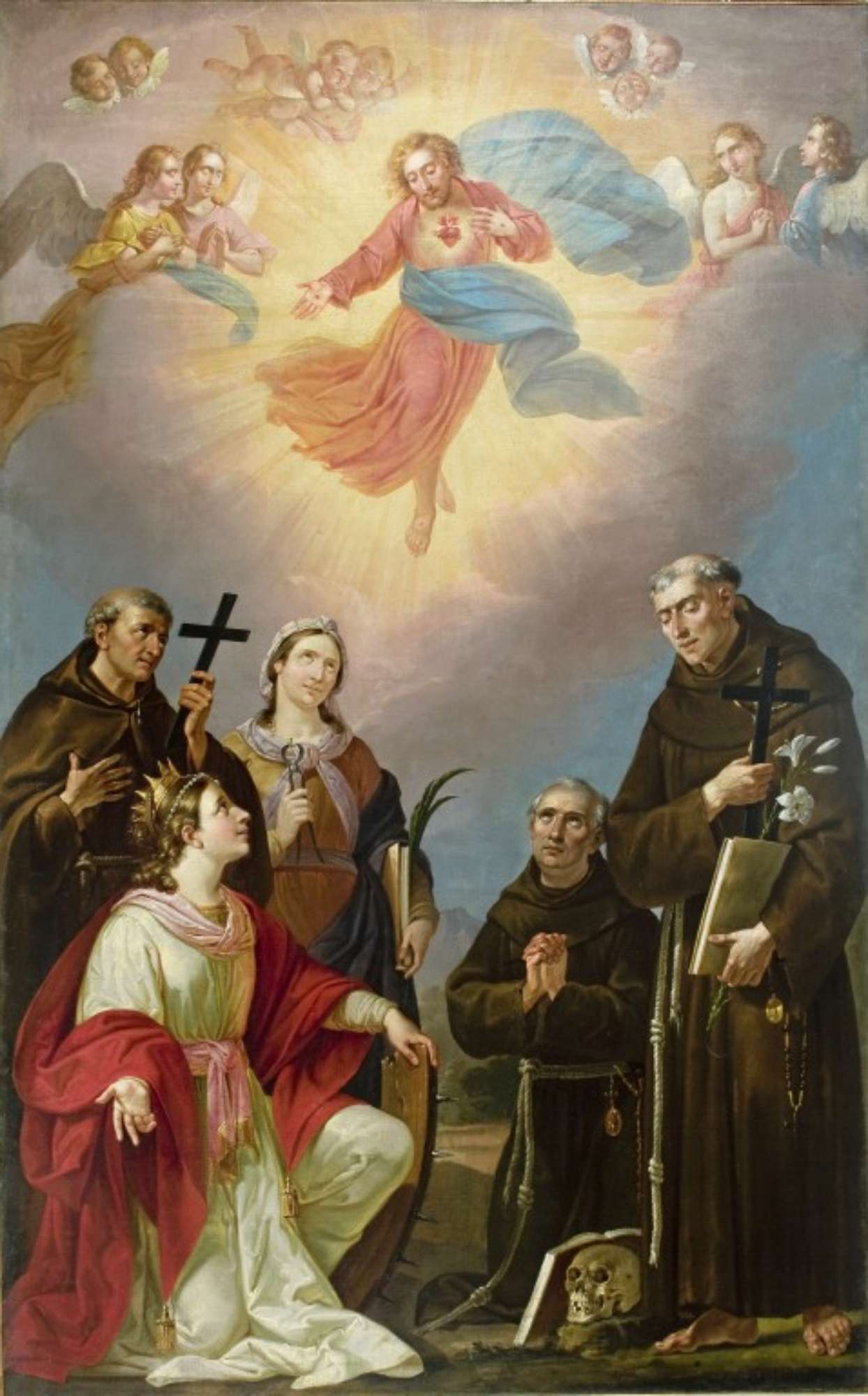 Gesù è circondato da una gloria di angeli ed in basso si vedono, raccolti in preghiera, i Santi Lorenzo, Pacifico da San Severino, Apollonia, Caterina ed Antonio da Padova.