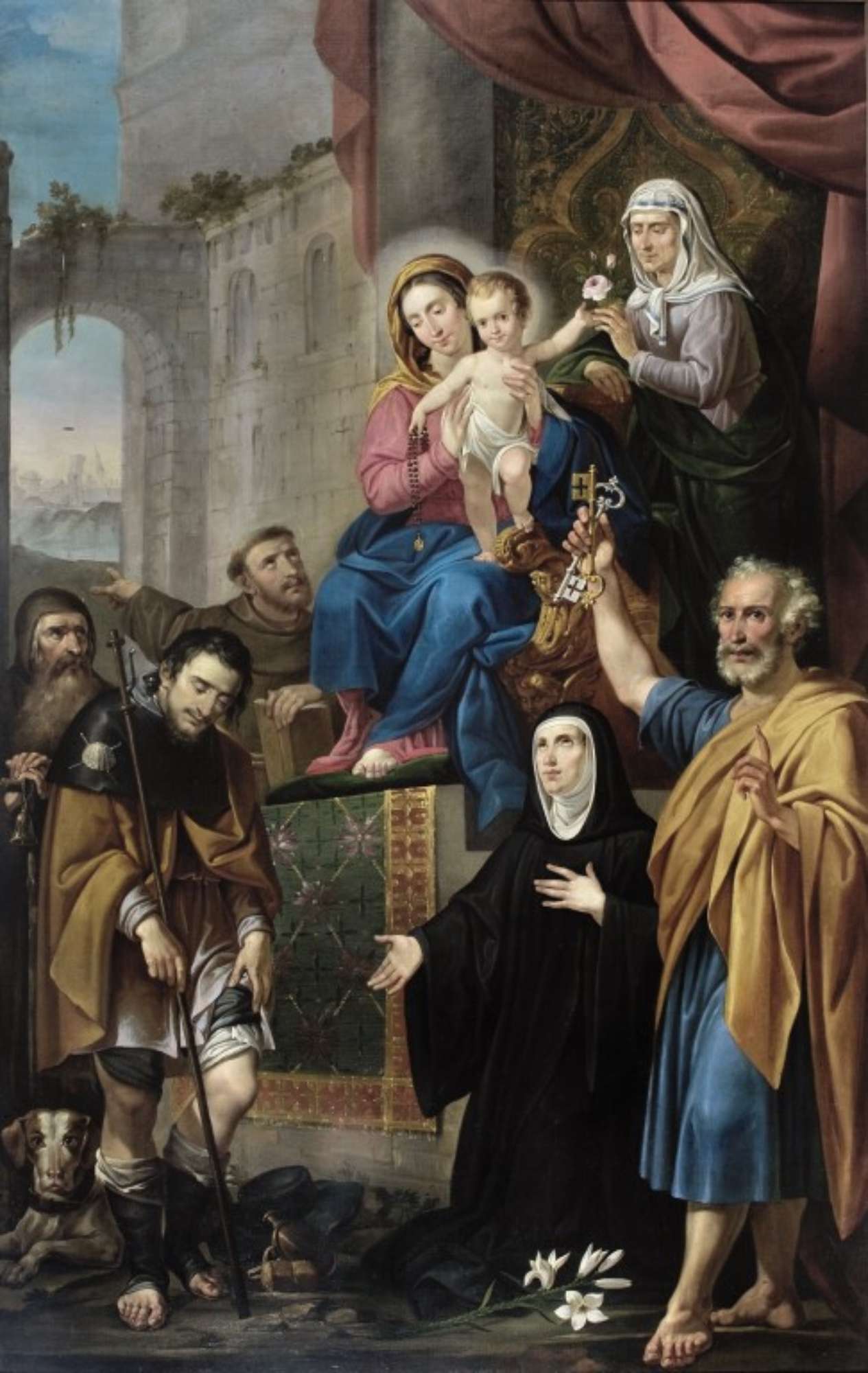In alto siede la Madonna con il Bambino in braccio. Dietro di lei vi è Sant'Anna. In primo piano San Rocco con il cane, Sant Antonio Abate, San Pietro, Santa Liberata e San Francesco Solano che chiede l'intercessione della Madonna contro il terremoto. Sullo sfondo si intravede il profilo di una città e delle architetture non ben definite.
