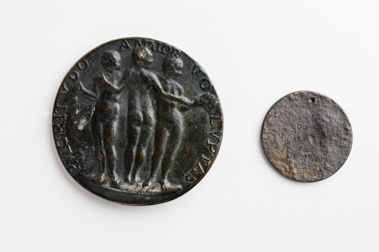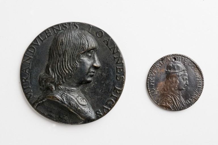 Su di un lato della medaglia vi è il busto di Giovanni Pico di profilo volto verso destra, indossa una corazza su cui vi è l'immagine di un cherubino emblema della saggezza. Sull'altro lato le tre grazie di cui una al centro girata di spalle e le altre rispettivamente a destra e a sinistra.