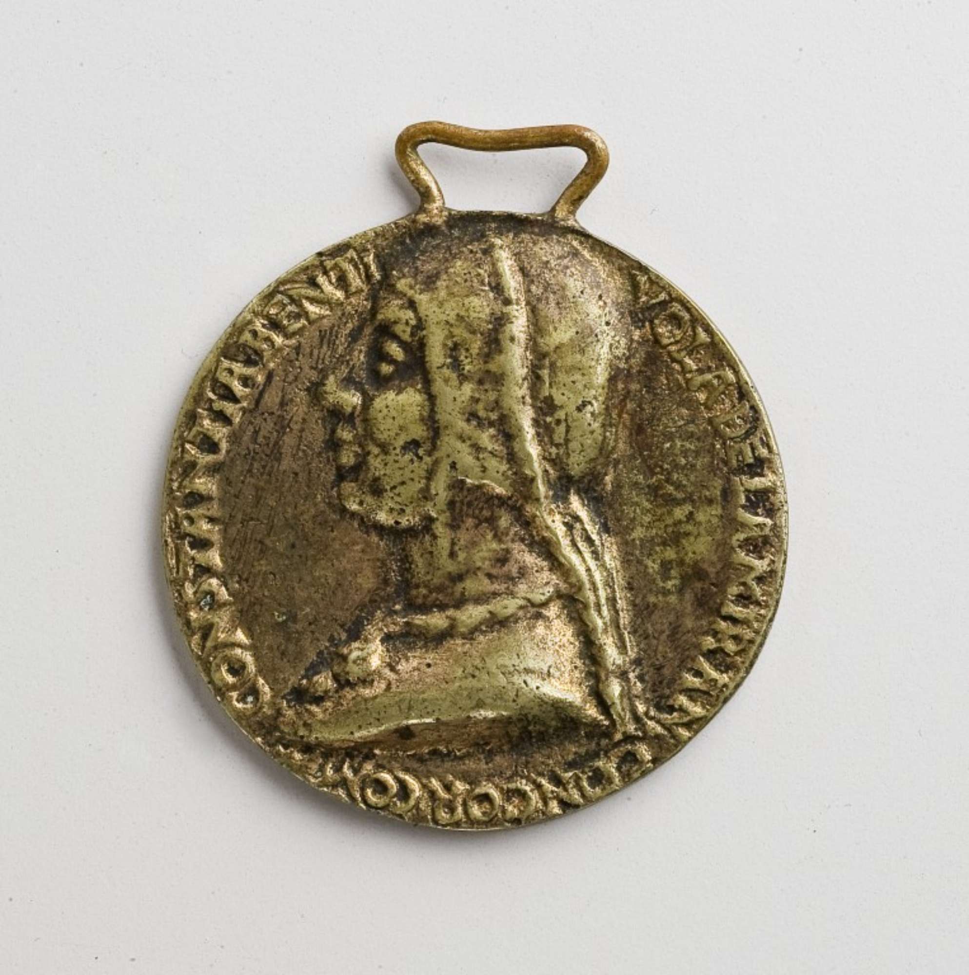 Medaglia a due facce, di cui la prima raffigurante il busto di Costanza Bentivoglio, capelli coperti e raccolti dietro alla testa con una cuffia, ha al collo una catena da cui pende un ciondolo. Sull'altro lato idolo femminile nudo appoggiato ad un tronco di colonna a cui è appoggiato uno scudo, nella mano destra stringe una lancia.