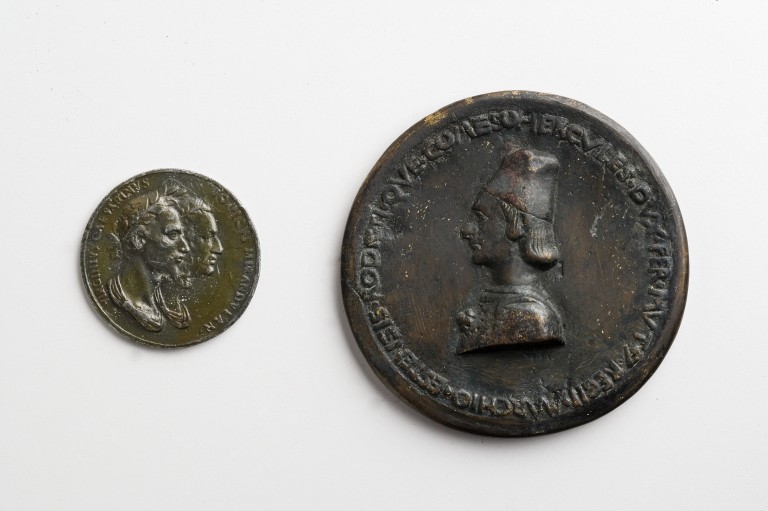 Medaglione di forma rotonda. Su di un lato ritratto di Ercole I di profilo girato verso sinistra che indossa un alto berretto. Sull'altro lato cavaliere armato con il bastone del comando in sella ad un grosso cavallo. In alto impronta del foro che non venne però realizzato.