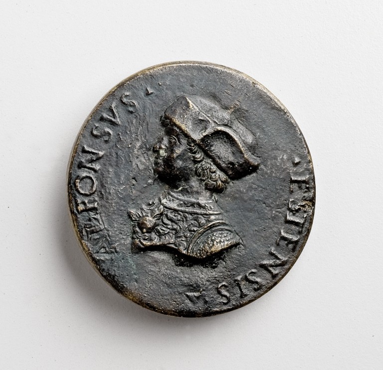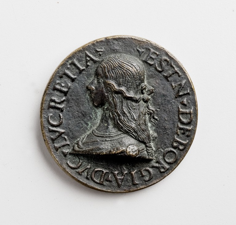 Medaglione di forma rotonda. Su di un lato ritratto di Lucrezia ritratta a mezzo busto di profilo verso sinistra. Sull'altro lato ritratto di Alfonso d'Este di profilo rivolto verso sinistra con berretto in testa.