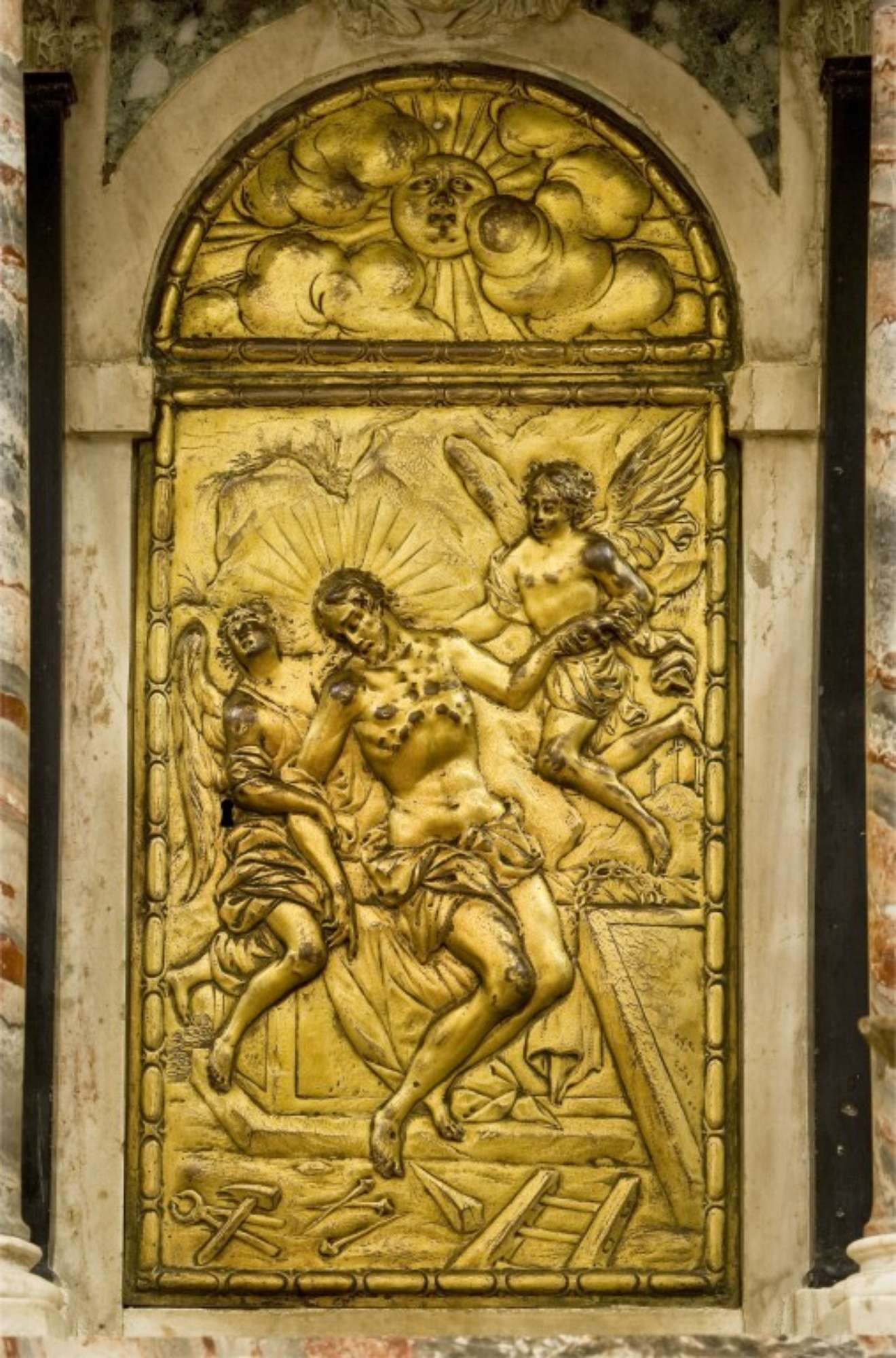 Rame dorato eseguito a sbalzo e bassorilievo, rifinito a bulino. Sportello a forma centinata, inquadrato in fascia perlinata. Nello spazio superiore vi è il sole oscurato da nubi mentre in basso vi è Cristo deposto nel sepolcro.