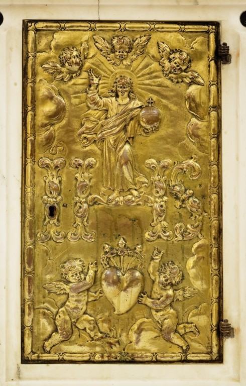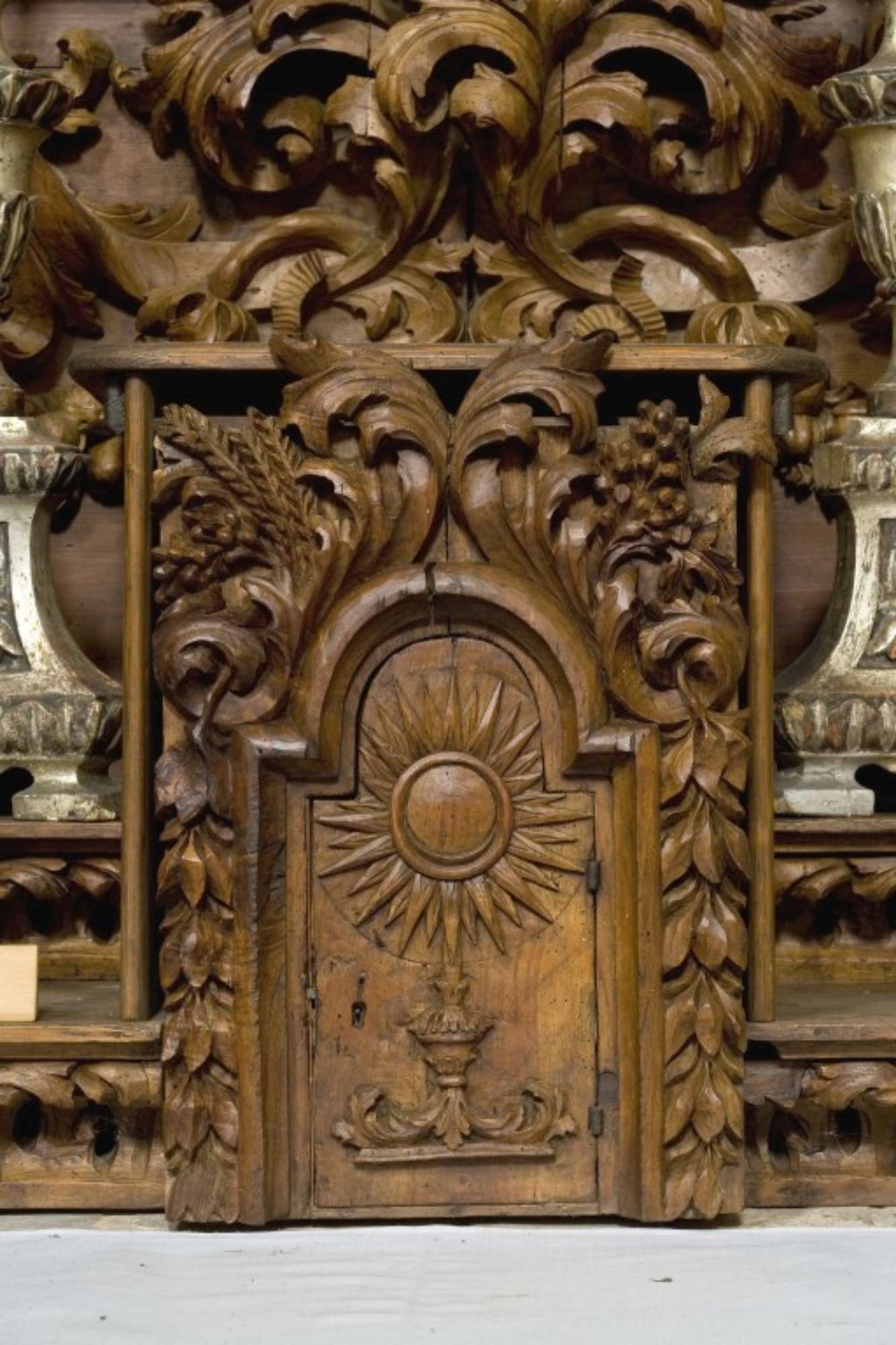 Legno di cipresso intagliato e verniciato di scuro. Ornamenti a bassorilievo e tuttotondo. Nella fascia ornamentale in alto vi sono festoni cadenti e fogliami. Lo sportellino è centinato e scantonato.