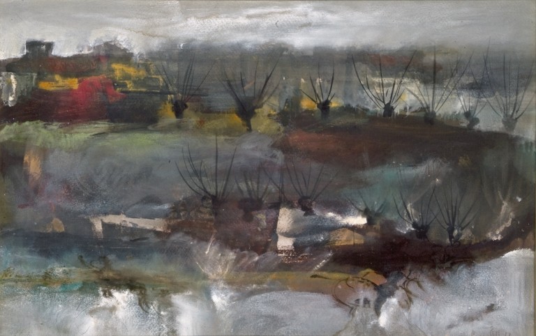 Il dipinto ritrae un estremo scorcio di periferia, con un gruppo di case sulla sinistra e una campagna invernale, punteggiata da alberi che innalzano rami spogli, in un'atmosfera con vapori di nebbia.